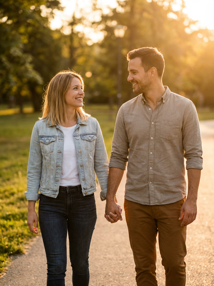 romantic photo of model with handsome boyfriend, couple holding hands walking through park at golden hour, casual date outfit, natural lighting, genuine smiles