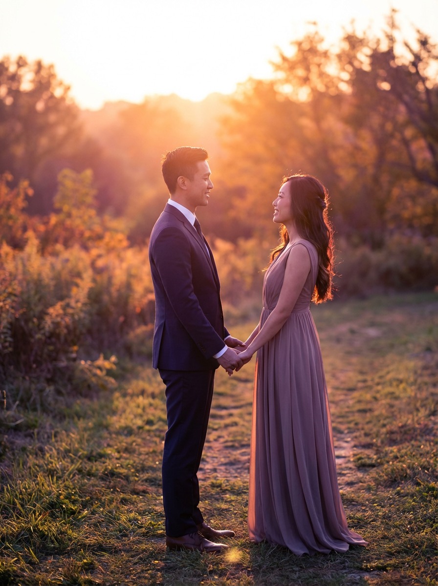 Romantic pre-wedding photoshoot at golden hour. Model wearing a stylish suit . Holding hands, looking into each other's eyes, dreamy sunset background.