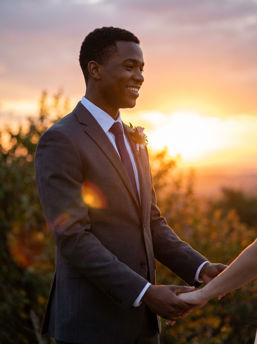 Romantic pre-wedding photoshoot at golden hour. Model wearing a stylish suit . Holding hands, looking into each other's eyes, dreamy sunset background.