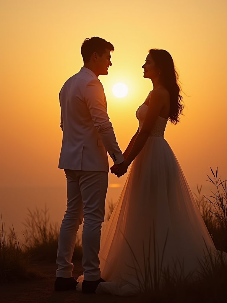 Romantic pre-wedding photoshoot at golden hour. Wearing a flowing romantic dress . Holding hands, looking into each other’s eyes, dreamy sunset background.