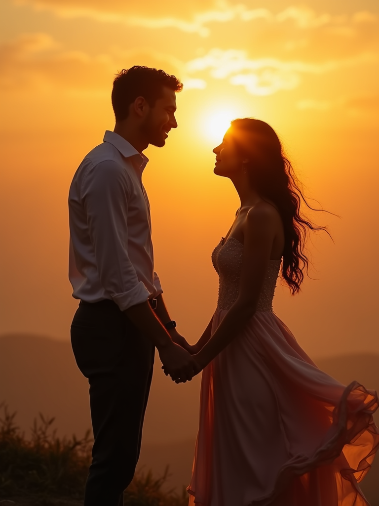 Romantic pre-wedding photoshoot at golden hour. Wearing a flowing romantic dress . Holding hands, looking into each other’s eyes, dreamy sunset background.