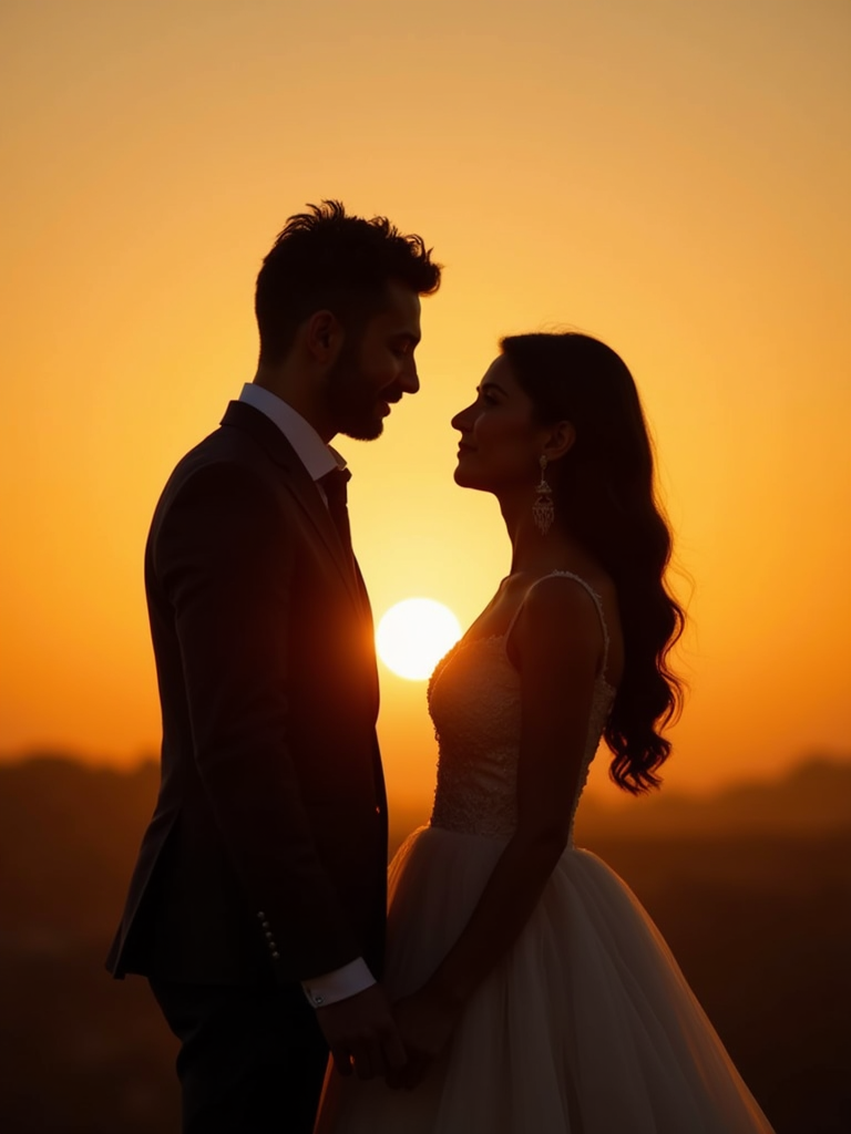 Romantic pre-wedding photoshoot at golden hour. Wearing a stylish suit . Holding hands, looking into each other’s eyes, dreamy sunset background.