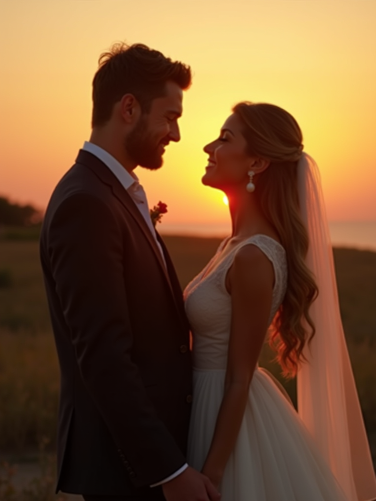 Romantic pre-wedding photoshoot at golden hour. Wearing a stylish suit . Holding hands, looking into each other’s eyes, dreamy sunset background.