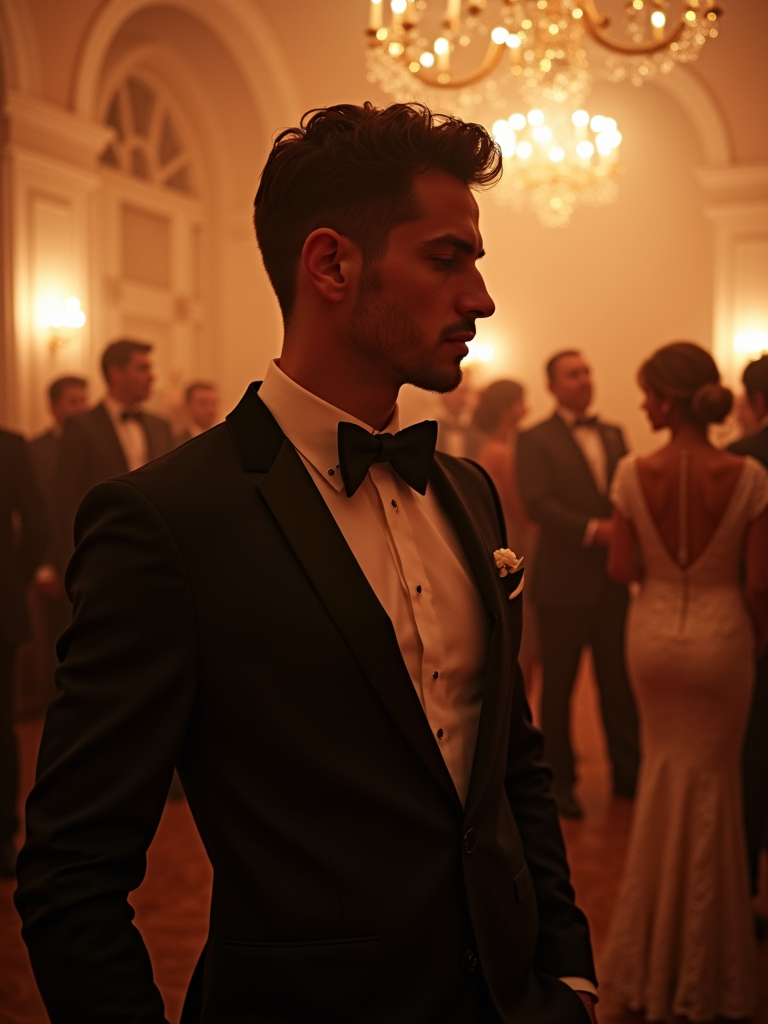 Romantic wedding reception scene, dancing under soft glowing lights. Model wearing a fitted wedding tuxedo with elegant lapels . Stylish and refined.