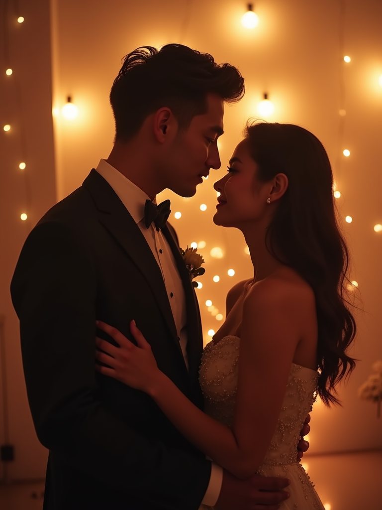 Romantic wedding reception scene, dancing under soft glowing lights. Model wearing a fitted wedding tuxedo with elegant lapels . Stylish and refined.