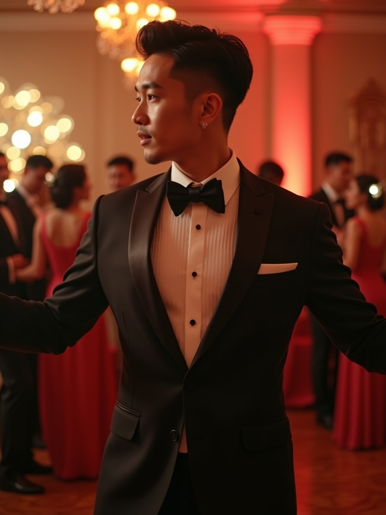 Romantic wedding reception scene, dancing under soft glowing lights. Model wearing a fitted wedding tuxedo with elegant lapels . Stylish and refined.