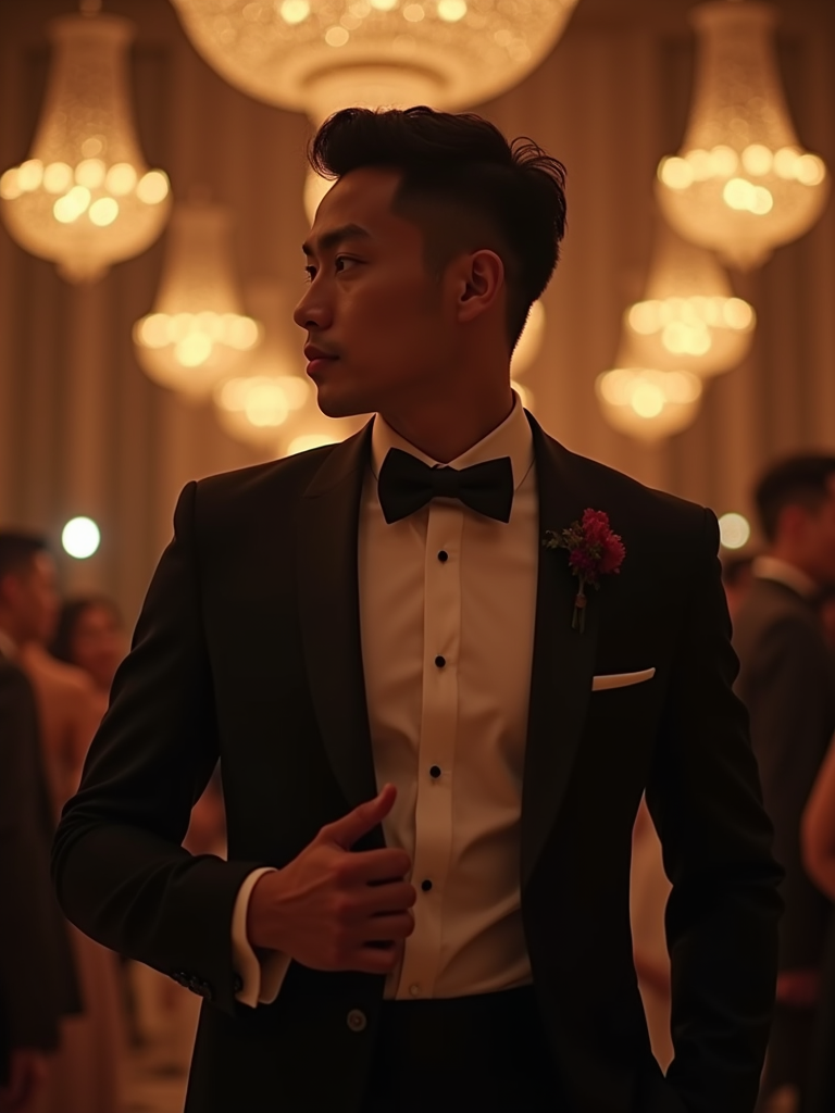 Romantic wedding reception scene, dancing under soft glowing lights. Model wearing a fitted wedding tuxedo with elegant lapels . Stylish and refined.