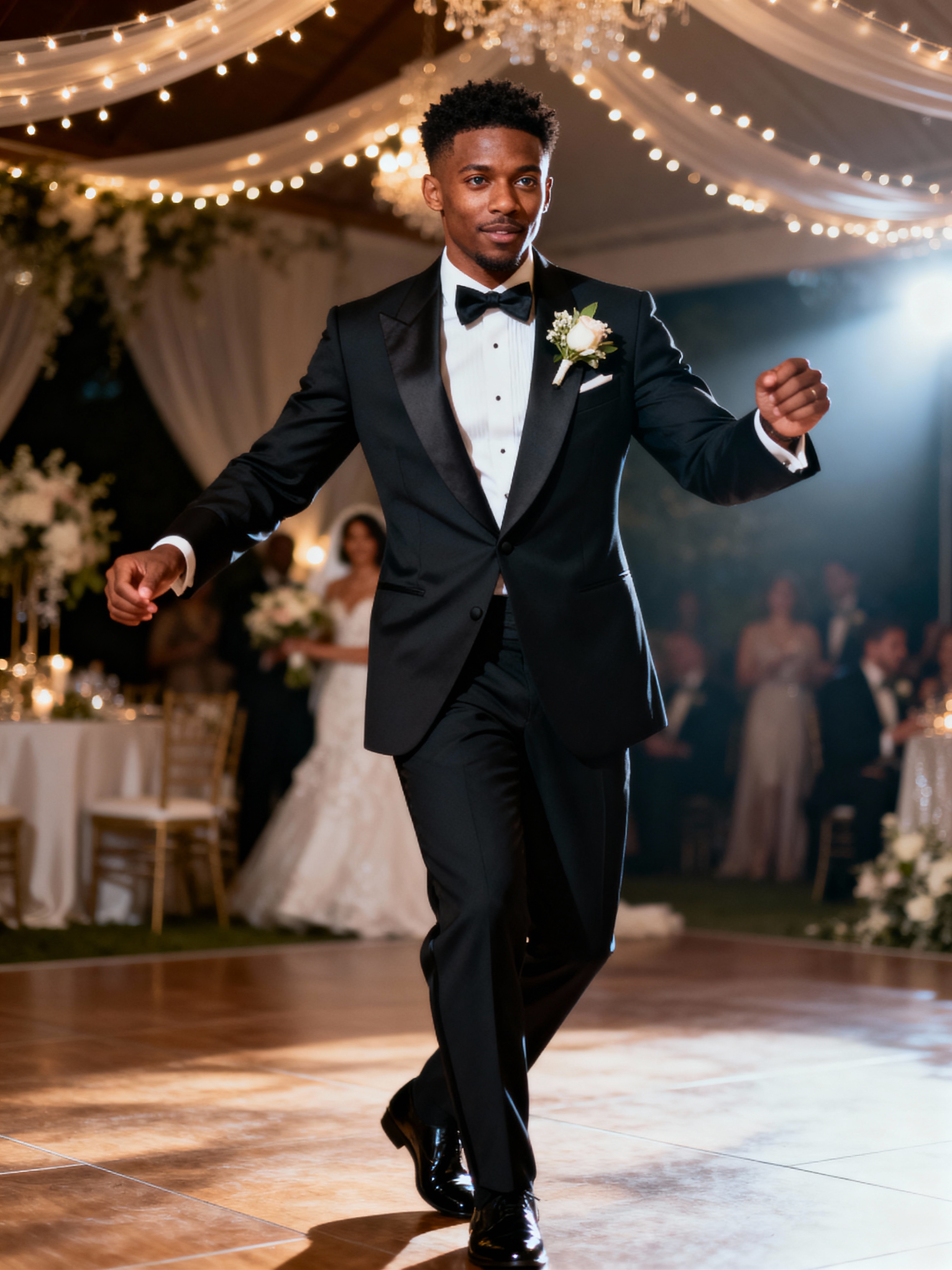 Romantic wedding reception scene, dancing under soft glowing lights. Model wearing a fitted wedding tuxedo with elegant lapels and boutonnière . Stylish and refined.