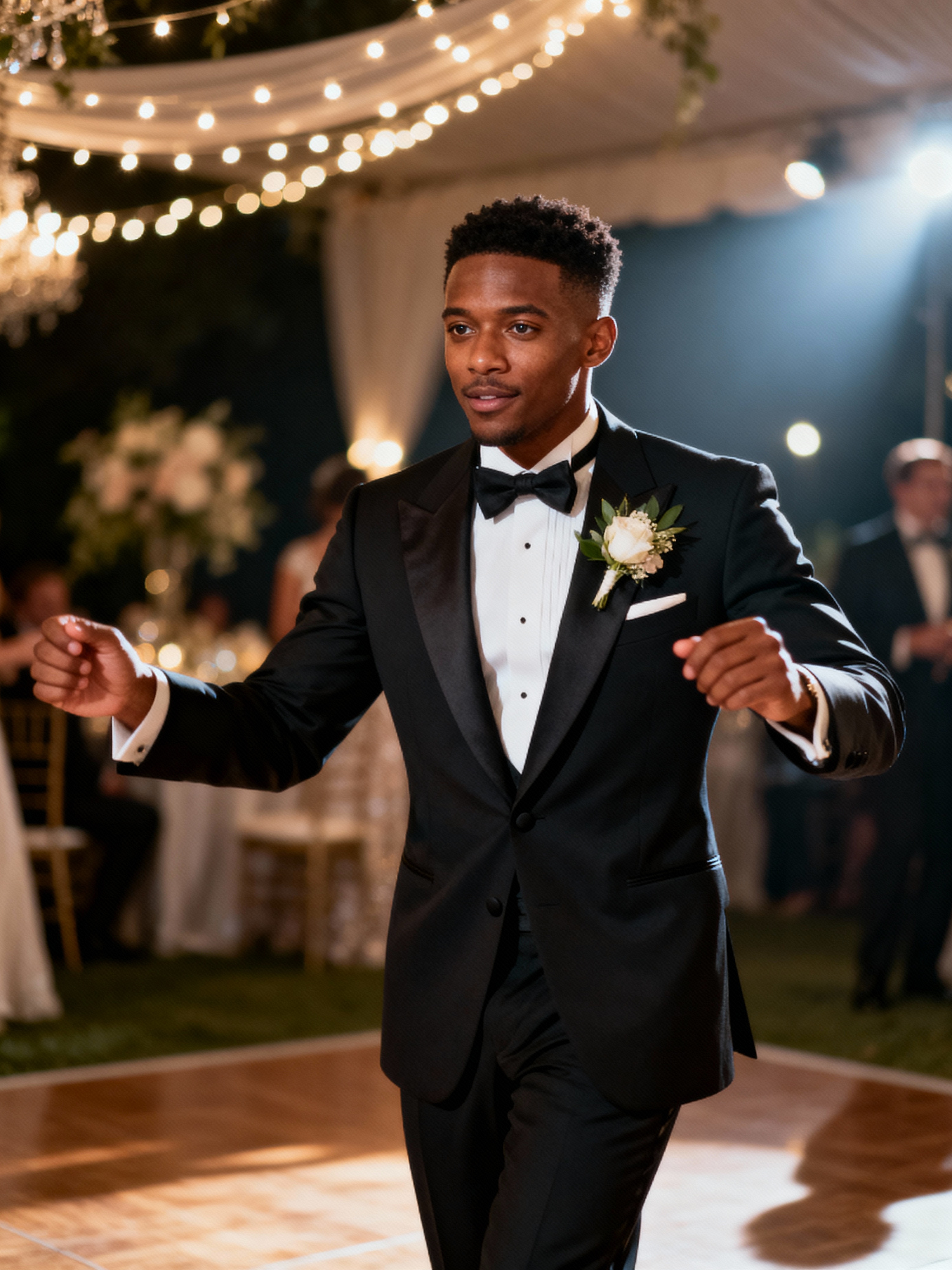 Romantic wedding reception scene, dancing under soft glowing lights. Model wearing a fitted wedding tuxedo with elegant lapels and boutonnière . Stylish and refined.