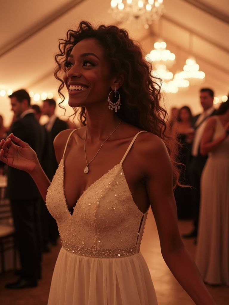 Romantic wedding reception scene, dancing under soft glowing lights. Model wearing a classy white dress with subtle sparkles . Stylish and refined.