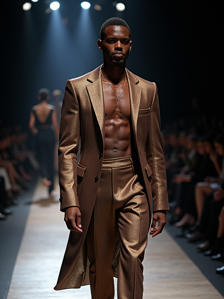 Runway insanely beautiful model in fashion show setting. Wearing high-fashion outfit, commanding presence. Catwalk lighting, fashion show atmosphere.
