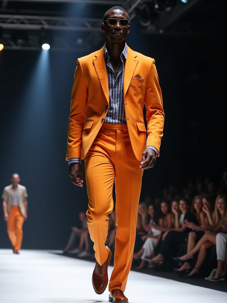 Runway insanely beautiful model in fashion show setting. Wearing high-fashion outfit, commanding presence. Catwalk lighting, fashion show atmosphere.