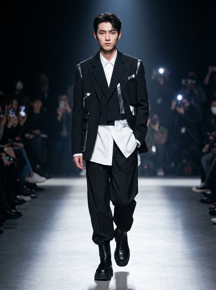 Runway insanely beautiful model in fashion show setting. Wearing high-fashion outfit, commanding presence. Catwalk lighting, fashion show atmosphere.