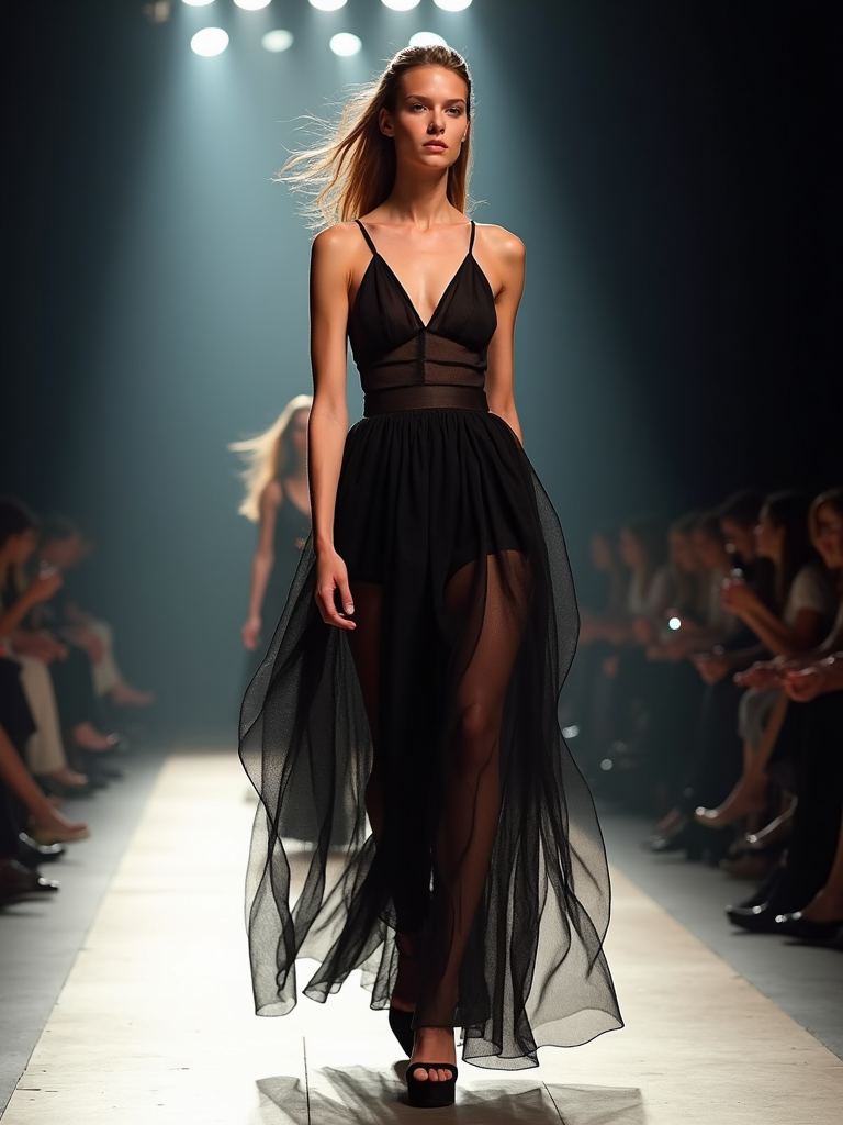 Runway insanely beautiful model in fashion show setting. Wearing avant-garde fashion, dramatic walk pose . Catwalk lighting, fashion show atmosphere.