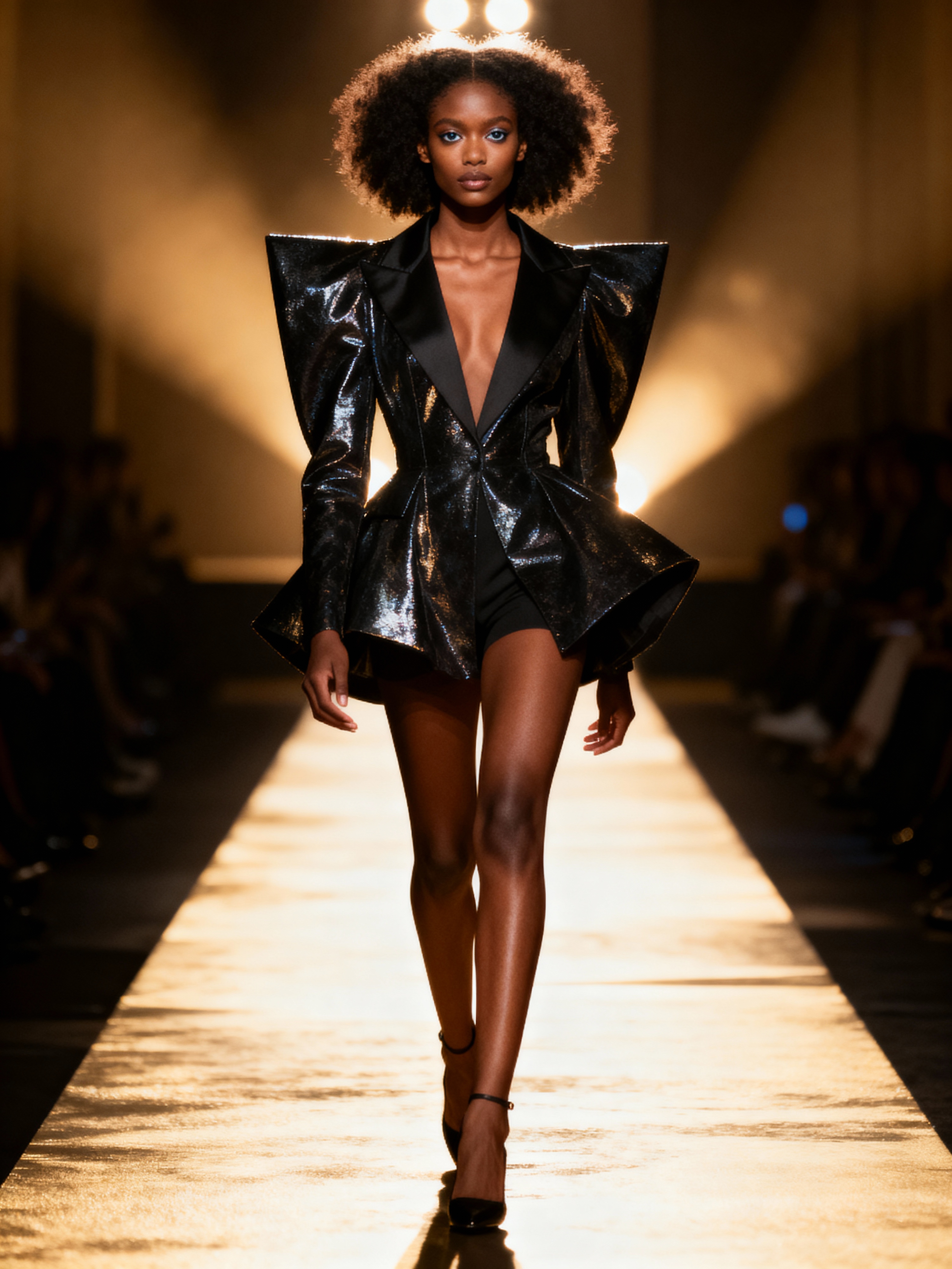 Runway insanely beautiful model in fashion show setting. Wearing avant-garde fashion, dramatic walk pose . Catwalk lighting, fashion show atmosphere.