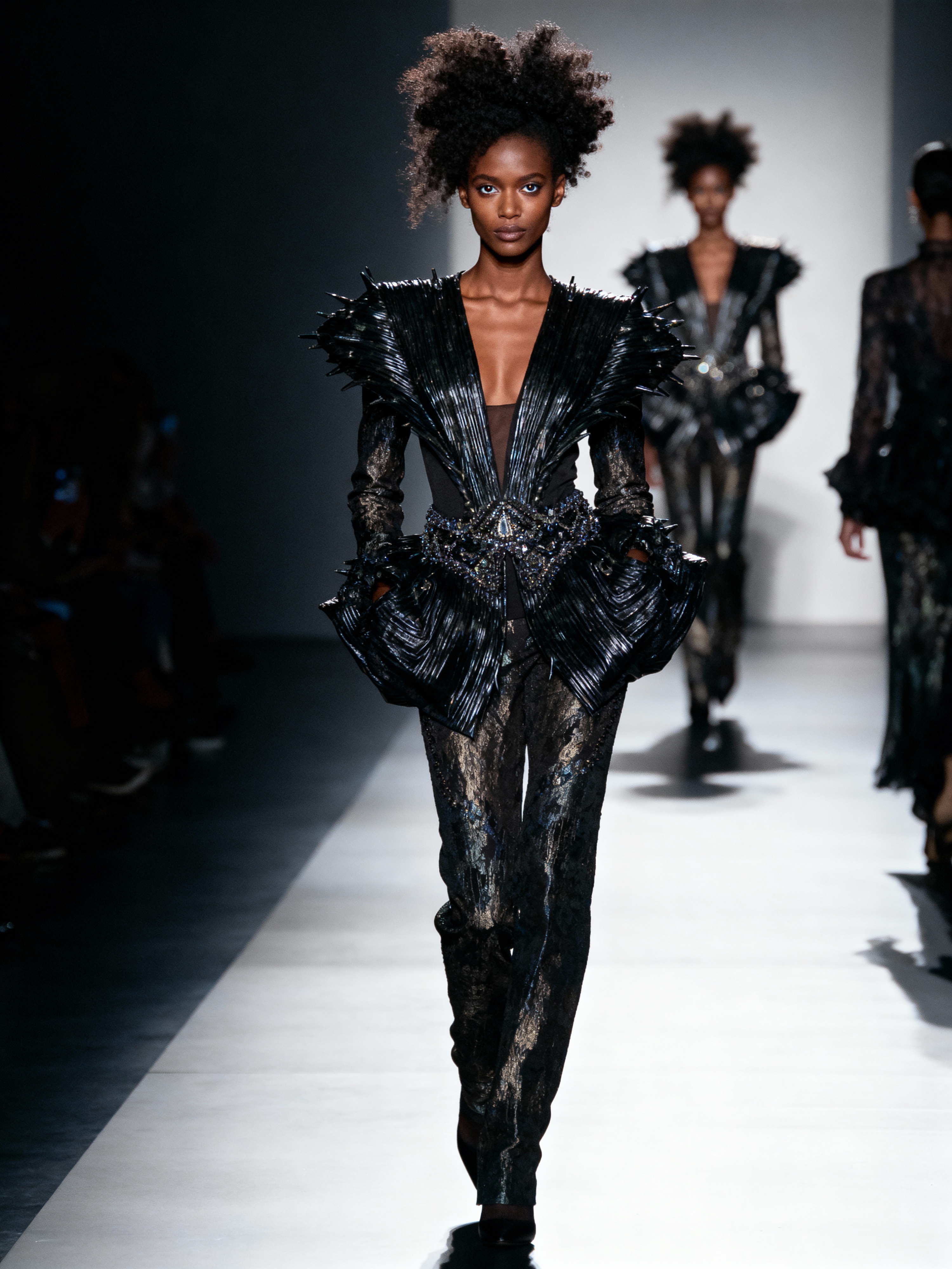 Runway insanely beautiful model in fashion show setting. Wearing avant-garde fashion, dramatic walk pose . Catwalk lighting, fashion show atmosphere.