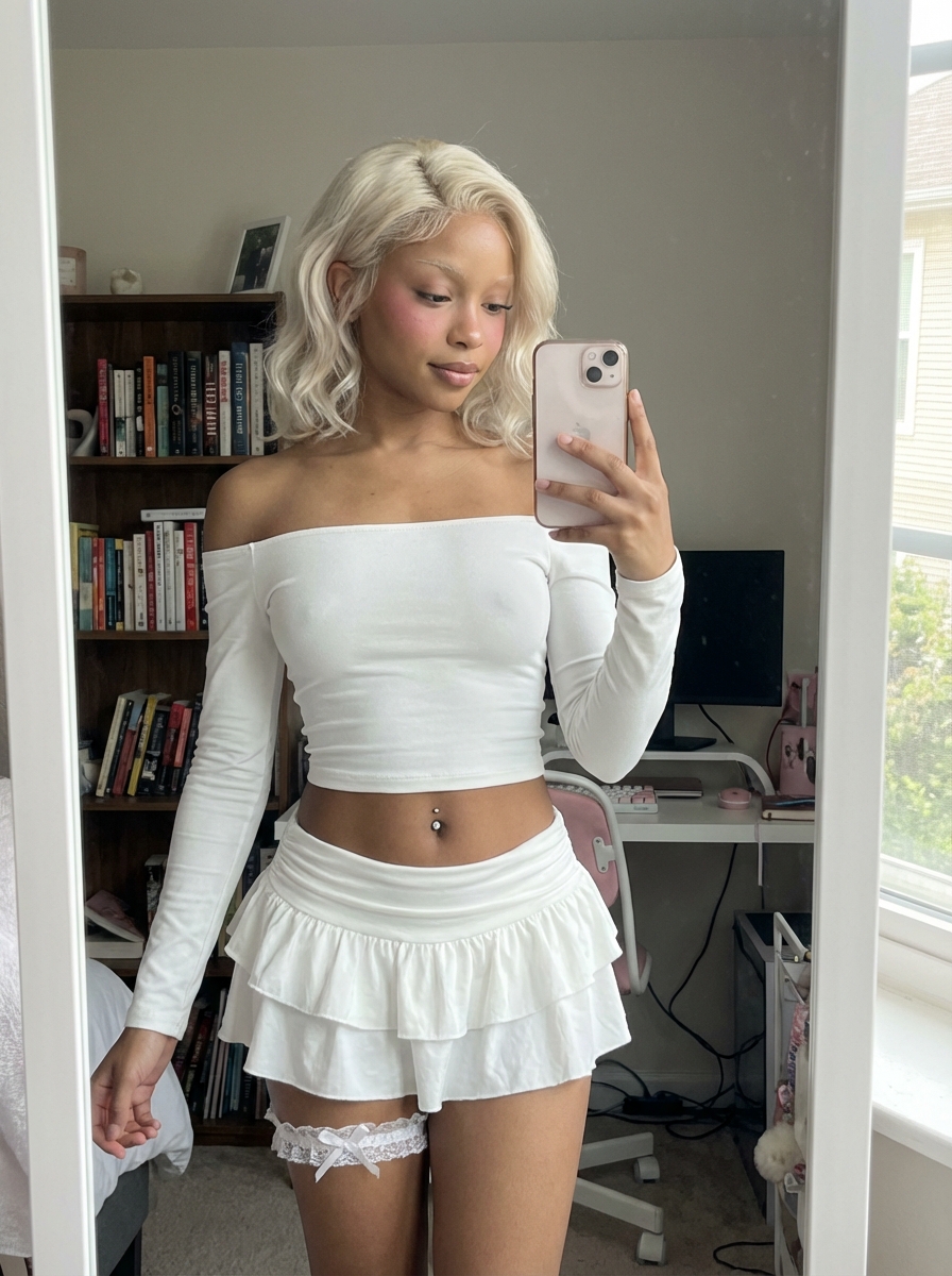 {"scene": "bedroom mirror selfie, home setting with bookshelf and desk setup", "subject": {"character": "PLATINUM BLONDE model, early 20s, petite slim frame", "face": {"structure": "soft features, delicate jawline, doll-like", "skin": "porcelain pale with pink blush on cheeks", "eyes": {"shape": "large doe eyes", hair, "expression": "looking down at phone screen, soft dreamy"}, "mouth": {"lips": "full, natural pink, relaxed soft pout"}, "makeup": "natural with heavy pink blush , subtle"}, "hair": {hair, "length": "shoulder length", "texture": "soft wavy, slightly messy", "style": "middle part, loose waves framing face", "shine": "healthy shine"}}, "pose": {"overall": "standing mirror selfie, relaxed casual", "position": {"base": "standing in front of mirror", "orientation": "facing mirror straight on"}, "torso": {"direction": "facing camera", "posture": "relaxed, slight hip tilt"}, "arms": {"right": "holding iphone up taking selfie", "left": "relaxed at side"}, "head": {"angle": "looking at phone screen", "expression": "soft, casual, candid"}}, "outfit": {"top": {"type": "off-shoulder long sleeve crop top ", "fit": "tight, form fitting", "neckline": "off shoulder, exposing collarbones", "length": "cropped, exposing midriff and stomach"}, "bottom": {"type": "ruffled micro if(gender=f){mini skirt } ", "style": "tiered ruffles, very short", "length": "extremely short, barely covering"}, "accessories": {"garter": "lace garter on upper thigh", "piercing": "belly button piercing, small silver"}}, "body": {"type": "slim, toned, petite", "midriff": "flat toned stomach exposed", "skin": "pale porcelain, smooth"}, "environment": {"location": "bedroom, personal space", "background": {"furniture": "bookshelf unit behind", "items": "books, skincare products, perfumes on shelves", "desk": "computer setup visible, keyboard, monitor", "aesthetic": "messy but curated, lived-in"}, "mirror": "full length or large mirror for selfie"}, "lighting": {"type": "natural daylight from window", "quality": {"intensity": "soft, bright, flattering", "direction": "front or side natural light"}, "on_subject": {"skin": "soft glow, smooth", "hair": "platinum catching light"}}, "photography": {"type": "mirror selfie, iphone photo", "angle": "straight on, eye level", "framing": "waist up to full body", "focus": "sharp on subject", "style": "casual instagram (do not show layout or UI) selfie, candid bedroom"}, "color_palette": {"subject": {"hair": "PLATINUM white-silver blonde", "skin": "porcelain pale with pink blush ", "outfit": "all with lace accent"}, "environment": {"bookshelf": "with colorful book spines", "overall": "neutral bedroom tones"}}, "vibe": {"energy": "casual, candid, effortlessly pretty", "mood": "soft, dreamy, bedroom aesthetic", "aesthetic": "instagram (do not show layout or UI) baddie meets soft model"}, "critical_requirements": {"HAIR": "platinum blonde shoulder length, soft waves", "FACE": "pink blush on cheeks, soft expression, looking at phone", "TOP": "off-shoulder long sleeve crop top ", "SKIRT ": "ruffled micro if(gender=f){mini skirt } ", "MIDRIFF": "exposed toned stomach with belly piercing", "GARTER": "lace garter visible on thigh", "SETTING": "bedroom with bookshelf and desk behind", "STYLE": "mirror selfie with iphone"}}
