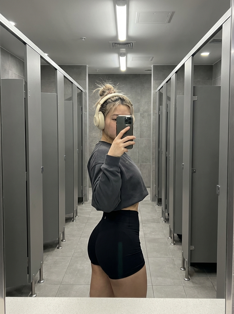 {"scene_description": "A casual, fitness-focused mirror selfie of a young model posing in a side profile within a modern locker room or restroom setting.", "subject": {"type": "young ", "age": "early 20s", "features": {"hair": "light hair styled in a messy updo or claw clip with loose strands framing the face", "expression": "obscured by the smartphone, implying anonymity and focus on the physique", "other": " tone, fit physique."}, "attire": "long-sleeve cropped sweatshirt paired with tight-fitting athletic booty shorts", "position": "standing in profile, twisting the torso towards the mirror to accentuate curves, with one leg slightly bent"}, "action": {"primary": "taking a mirror selfie with a smartphone held in the right hand", "secondary": "posing to showcase the fitness outfit and physique", "effect": "capturing a 'gym fit check' or casual lifestyle moment"}, "environment": {"setting": "modern public restroom or gym locker room", "foreground_elements": ["bathroom mirror reflection", "sink faucet visible at the very bottom edge."], "background": "matte grey stall doors and tiled walls, typical of institutional or gym architecture"}, "lighting": {"style": "soft overhead artificial lighting", "key_light": {"type": "fluorescent or LED ceiling fixtures", "color": "neutral white", "illuminates": ["the subject clearly from above", "soft highlights on the hair and headphones"]}, "background_light": {"color": "flat grey ambient light"}, "shadows": "soft, diffuse shadows defining body contours"}, "style": {"medium": "Smartphone Photography (Mirror Selfie)", "aesthetic": "social media lifestyle, athleisure, casual gym aesthetic", "quality": "sharp smartphone resolution", "details": "texture of the cotton sweatshirt versus the smooth spandex shorts"}, "scene_composition": {"subject_action": "centered vertical framing", "camera_behavior": "mirror reflection perspective", "depth_layering": "subject clearly defined against the flat, geometric background of the stalls."}, "visual_description": {"core_subject": "A trendy figure capturing a daily routine moment.", "attire_physics": "loose fit of the crop top contrasting with the skin-tight fit of the shorts.", "skin_rendering": "smooth and naturally lit by indoor lighting."}, "lighting_and_atmosphere": {"type": "Indoor Functional", "specifics": "Clean and neutral environment", "color_grade": "Desaturated cool tones (greys and blacks) with the subject's skin and hair providing warmth."}, "attire_customization": {"current_clothing": "crop sweatshirt and shorts", "customizable_clothing": "oversized hoodie or matching gym set."}, "brand_product_customization": {"current_brand_product": "Smartphone (iPhone style), Over-ear headphones", "customizable_brand": "N/A", "customizable_product": "Headphones color", "product_placement_area": "Head/Ears"}, "objects_and_props": {"main_objects": ["Smartphone in case", "Cream/beige over-ear headphones"], "secondary_objects": ["Stall door icons (shower symbols)"]}, "camera_and_lens": {"focal_length_feel": "26mm equivalent (smartphone main camera)", "aperture_effect": "wide depth of field keeping background stalls recognized", "camera_angle": "Eye-level mirror reflection", "lens_type": "Wide-angle smartphone lens", "bokeh_style": "None"}}