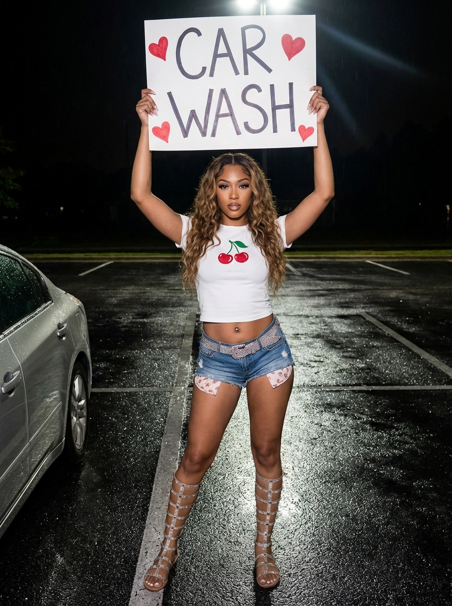 {"scene_description": "A full-body nighttime portrait of a young model standing in a wet parking lot, holding a handwritten 'CAR WASH' sign above her head, illuminated by a direct camera flash.", "subject": {"type": "young model", "age": "Early 20s", "features": {"hair": "Long, voluminous, dark wavy hair cascading over shoulders", "expression": "Confident, alluring gaze directly at the camera with slightly parted lips", "other": "Sun-kissed, toned midriff with belly button piercing, defined makeup with glossy lips ."}, "attire": "fitted baby tee with a red cherry graphic containing the number 3, extremely short low-rise denim cutoffs with exposed patterned pocket linings, a sparkling rhinestone belt, and strappy gladiator sandals wrapping up to the knees", "position": "Standing facing forward, arms raised holding a sign, legs slightly apart with weight balanced"}, "action": {"primary": "Holding a poster board sign reading 'CAR WASH' with red heart drawings above her head", "secondary": "Posing with a confident, slightly arched posture", "effect": "Evokes a nostalgic Y2K pop-culture aesthetic with a bold, street-style vibe"}, "environment": {"setting": "Outdoor parking lot at night", "foreground_elements": ["Wet asphalt reflecting light", "Partial view of a silver car's side and wing mirror on the left edge"], "background": "Dark surroundings with blurred shapes of parked cars and distant overhead lights creating bokeh"}, "lighting": {"style": "Direct flash photography (paparazzi style)", "key_light": {"type": "Hard frontal flash", "color": "Cool white", "illuminates": ["Subject's face and torso evenly", "Reflective highlights on the wet pavement and car metal"]}, "background_light": {"color": "Dim ambient urban night tones (faint greens and whites)"}, "shadows": "Hard, distinct shadow cast behind the subject on the ground"}, "style": {"medium": "Digital Photography mimicking 2000s compact camera flash", "aesthetic": "Y2K revival, baddie aesthetic, urban street fashion", "quality": "High contrast, sharp subject focus with slight film grain texture", "details": "Realistic skin texture under flash, wet ground reflections, detailed denim fabric"}, "scene_composition": {"subject_action": "Centered full-body framing", "camera_behavior": "Slight low angle to elongate the legs", "depth_layering": "Blurred foreground car element, sharp middle-ground subject, out-of-focus background."}, "visual_description": {"core_subject": "A stylish figure embodying early 2000s energy with a playful yet bold stance.", "attire_physics": "Straps of sandals pressing slightly into skin, hair volume held by humidity/product.", "skin_rendering": "High-shine highlights on skin due to flash lighting."}, "lighting_and_atmosphere": {"type": "Nighttime Flash Portrait", "specifics": "High contrast between the brightly lit subject and the dark, moody background", "color_grade": "Cool tones with popped reds (hearts, cherry graphic) and bright whites."}, "attire_customization": {"current_clothing": "cherry crop top , denim micro-shorts, gladiator wraps", "customizable_clothing": "Could be swapped for 'racerback tank top ' or 'cargo if(gender=f){mini skirt } ' for a similar aesthetic."}, "brand_product_customization": {"current_brand_product": "None specific, generic graphic tee", "customizable_brand": "N/A", "customizable_product": "N/A", "product_placement_area": "N/A"}, "objects_and_props": {"main_objects": ["poster board sign with 'CAR WASH' text and heart doodles."], "secondary_objects": ["Silver vehicle side mirror in foreground.", "Wet ground texture."]}, "camera_and_lens": {"focal_length_feel": "35mm or 50mm typically found on point-and-shoots", "aperture_effect": "f/4.0 providing subject sharpness but background separation", "camera_angle": "Eye level to slightly low angle", "lens_type": "Standard wide-normal", "bokeh_style": "Subtle background blur typical of flash photography in dark environments."}}