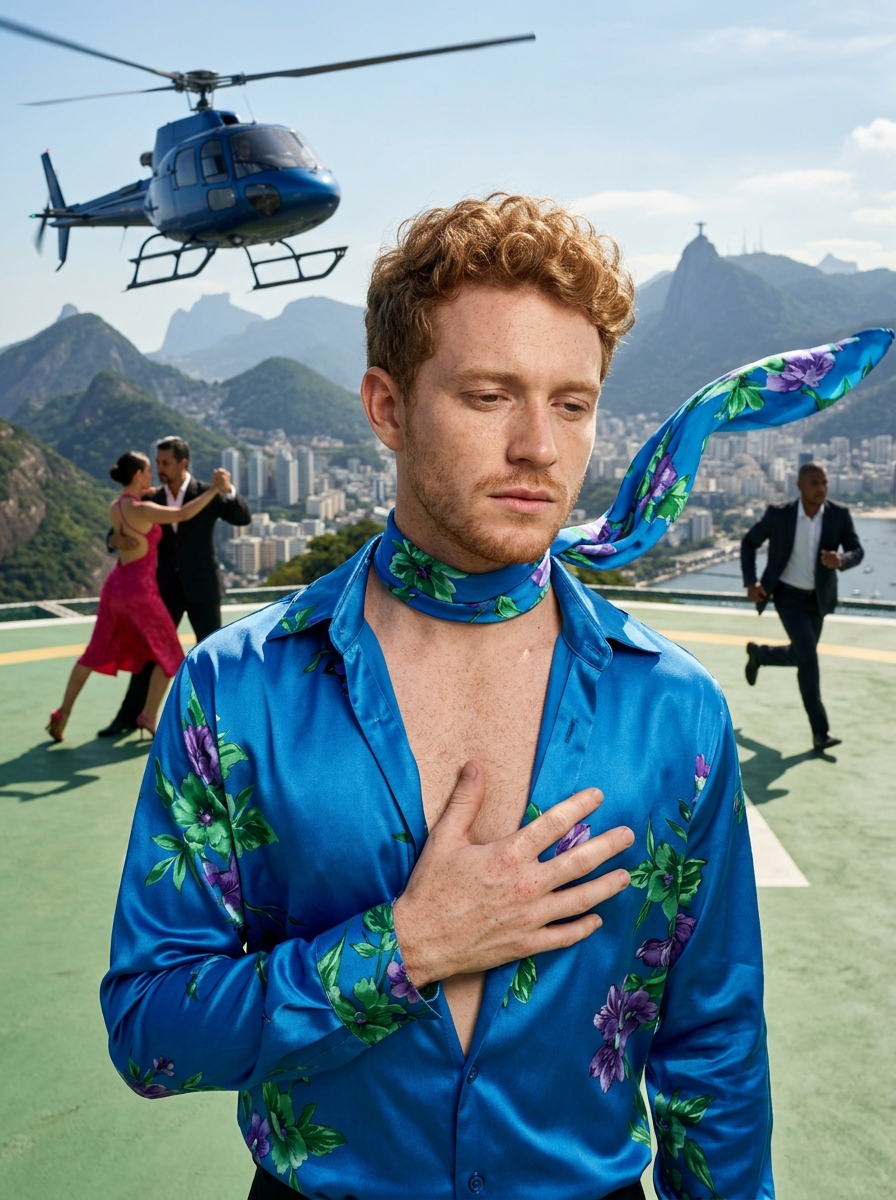 {"scene_description": "A high-end fashion editorial composition featuring a model in the foreground on a scenic overlook, set against a dynamic background of a helipad with a landing helicopter, dancing figures, and the cityscape of Rio de Janeiro.", "subject": {"type": "young male model", "age": "Early 20s", "features": {"hair": "Curly light reddish-brown hair, styled in a short tousled textured cut", "expression": "Introspective, calm, gaze cast slightly downward, hand placed firmly on chest", "skin": "Natural texture, with freckles, soft highlight on forehead, light stubble", "other": "Groomed natural look"}, "attire": "Vibrant blue satin open-collar shirt with a deep plunging V-neckline, adorned with green and purple floral patterns; matching fabric scarf flowing behind the neck", "pose_position": "Standing foreground right, medium shot from mid- up, body slightly angled towards center in confident stance, hand resting on sternum"}, "objects_and_props": {"main": ["Blue civilian helicopter in mid-air (upper left)", "Green helipad surface with directional arrows"], "secondary": ["A couple dancing tango (model in pink/red dress, model in suit)", "A model in a suit walking/running briskly across the helipad."]}, "environment": {"setting": "Outdoor scenic helipad overlooking a coastal city (resembling Rio de Janeiro)", "foreground_elements": ["Subject", "Green concrete helipad surface"], "background": "Iconic peaked mountain (Corcovado style), sprawling cityscape, large lagoon/bay, lush green vegetation on hillsides", "atmosphere": "Luxurious, cinematic, sunny, slightly breezy"}, "lighting": {"style": "Bright natural daylight with high contrast background and soft-lit foreground", "key_light": {"type": "Sunlight", "direction": "Overhead and slightly right", "color": "Neutral daylight white", "effects": ["Hard shadows cast by figures on the helipad", "Soft sheen on the satin shirt"]}, "shadows_contrast": "High contrast in the background scenery; distinct cast shadows on the green ground; balanced exposure on the foreground subject."}, "photography_style": {"medium": "Digital photography / Editorial composite", "aesthetic": "Vibrant fashion editorial, surreal luxury lifestyle, collage-like depth", "mood": "Elegant, busy yet calm foreground, dynamic background", "color_grading": "Saturated blues and greens, vivid colors, realistic but polished tones."}, "camera_and_lens": {"angle_view": "Eye-level relative to subject, slightly elevated view of the background", "framing_composition": "Rule of thirds (subject on right), layered composition with deep focus", "depth_of_field": "Deep depth of field, keeping both the foreground portrait and the background cityscape relatively sharp", "focal_length_feel": "Wide-angle feel (approx 35mm) to capture the subject and the expansive environment simultaneously", "bokeh_style": "N/A"}, "render_quality": {"realism": "Photorealistic", "resolution": "High resolution", "details": "Detailed fabric folds, texture of the concrete helipad, architectural details of the distant city, rotor blur on the helicopter"}}}