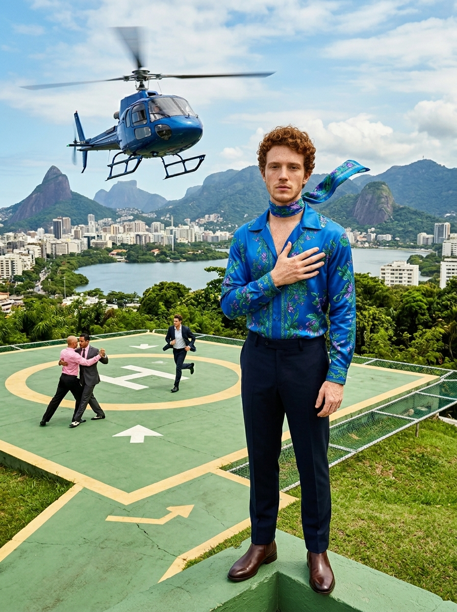 {"scene_description": "A high-end fashion editorial composition featuring a model in the foreground on a scenic overlook, set against a dynamic background of a helipad with a landing helicopter, dancing figures, and the cityscape of Rio de Janeiro.", "subject": {"type": "young male model", "age": "Early 20s", "features": {"hair": "Curly light reddish-brown hair, styled in a short tousled cut", "expression": "Introspective, calm, gaze cast slightly downward, hand placed firmly on chest", "skin": "Natural texture, with freckles, soft highlight on forehead, light stubble", "other": "Groomed natural look"}, "attire": "Vibrant blue satin open-collar shirt with a deep plunging V-neckline, adorned with green and purple floral patterns; matching fabric scarf flowing behind the neck", "pose_position": "Standing foreground right, medium shot from mid- up, body slightly angled towards center in confident stance, hand resting on sternum"}, "objects_and_props": {"main": ["Blue civilian helicopter in mid-air (upper left)", "Green helipad surface with directional arrows"], "secondary": ["A couple dancing tango (model in pink/red shirt, model in suit)", "A model in a suit walking/running briskly across the helipad."]}, "environment": {"setting": "Outdoor scenic helipad overlooking a coastal city (resembling Rio de Janeiro)", "foreground_elements": ["Subject", "Green concrete helipad surface"], "background": "Iconic peaked mountain (Corcovado style), sprawling cityscape, large lagoon/bay, lush green vegetation on hillsides", "atmosphere": "Luxurious, cinematic, sunny, slightly breezy"}, "lighting": {"style": "Bright natural daylight with high contrast background and soft-lit foreground", "key_light": {"type": "Sunlight", "direction": "Overhead and slightly right", "color": "Neutral daylight white", "effects": ["Hard shadows cast by figures on the helipad", "Soft sheen on the satin shirt"]}, "shadows_contrast": "High contrast in the background scenery; distinct cast shadows on the green ground; balanced exposure on the foreground subject."}, "photography_style": {"medium": "Digital photography / Editorial composite", "aesthetic": "Vibrant fashion editorial, surreal luxury lifestyle, collage-like depth", "mood": "Elegant, busy yet calm foreground, dynamic background", "color_grading": "Saturated blues and greens, vivid colors, realistic but polished tones."}, "camera_and_lens": {"angle_view": "Eye-level relative to subject, slightly elevated view of the background", "framing_composition": "Rule of thirds (subject on right), layered composition with deep focus", "depth_of_field": "Deep depth of field, keeping both the foreground portrait and the background cityscape relatively sharp", "focal_length_feel": "Wide-angle feel (approx 35mm) to capture the subject and the expansive environment simultaneously", "bokeh_style": "N/A"}, "render_quality": {"realism": "Photorealistic", "resolution": "High resolution", "details": "Detailed fabric folds, texture of the concrete helipad, architectural details of the distant city, rotor blur on the helicopter"}}}