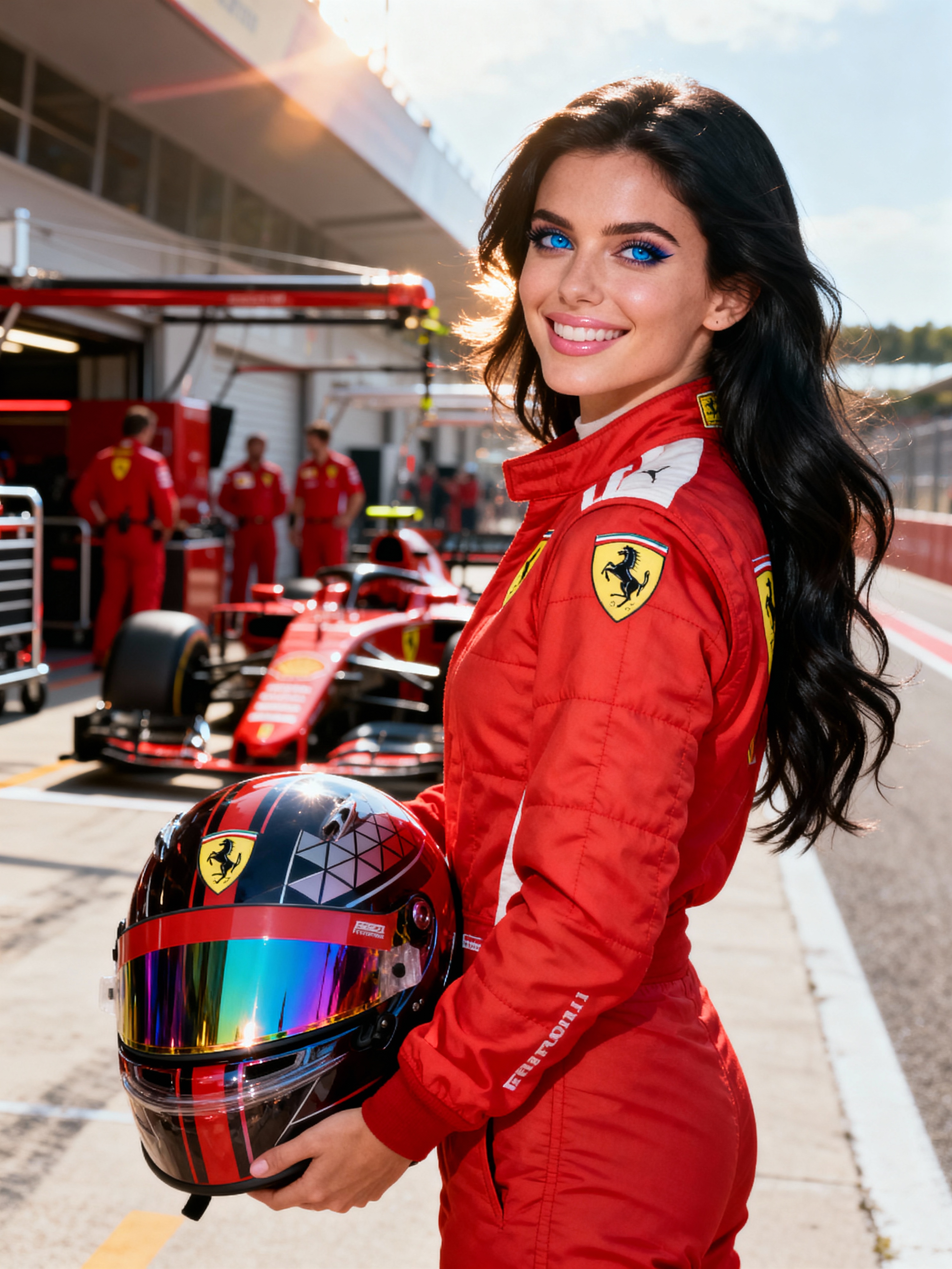 {"scene_description": "A premium, vibrant commercial portrait of an extremely beautiful and captivating model racing driver in a Ferrari Formula 1 pit lane. She smiles warmly while holding a Ferrari racing helmet. A Ferrari F1 car and Ferrari crew are visible in the background in soft focus.", "subject": {"type": "young model", "age": "early 20s", "appearance": {"hair": "long, glossy jet-hair, slightly wavy, flowing over the shoulders", "eyes": "bright blue eyes", "makeup": "glamorous smokey eye makeup, defined lashes , sculpted brows, subtle contour , soft nude-pink lipstick ", "expression": "bright genuine smile with visible teeth; confident, friendly, inviting", "skin": "natural healthy glow, realistic skin texture (not plastic)"}, "attire": {"outfit": "Ferrari F1-style racing suit in iconic Ferrari red with accents, tailored fit", "branding": "Ferrari shield-style patch visible; keep sponsor patches minimal and realistic-looking without readable text"}, "pose": {"body": "standing, torso turned slightly sideways", "head": "looking back over her left shoulder toward the camera", "hands": "left hand holding a Ferrari helmet at hip level; right arm relaxed"}}, "props": {"helmet": "Ferrari racing helmet with a glossy finish, subtle geometric striping, and an iridescent mirrored visor"}, "environment": {"setting": "Formula 1 pit lane / paddock", "background": {"main": "a red Ferrari Formula 1 car parked behind her (clearly recognizable silhouette, soft focus)", "secondary": "Ferrari crew members in red uniforms, pit garage structures, equipment trolleys", "depth_of_field": "strong background blur while preserving recognizable Ferrari context"}}, "lighting": {"style": "bright natural daylight, clean high-end commercial look", "key_light": "diffused sunlight with warm highlights on face and hair", "shadows": "soft flattering shadows, open shade feel", "reflections": "realistic reflections on helmet visor and suit fabric"}, "style": {"medium": "high-end digital portrait photography", "aesthetic": "premium sports lifestyle, Ferrari F1 vibe", "quality": "ultra high resolution, sharp focus on face and eyes, vibrant natural colors", "details": "visible suit fabric weave, realistic stitching, embroidered patch texture, clean bokeh"}, "composition": {"camera_angle": "eye-level", "framing": "3/4 body portrait with helmet fully visible", "depth": "shallow depth of field, subject dominates the frame"}, "camera_and_lens": {"lens": "telephoto prime", "focal_length_feel": "85mm to 105mm", "aperture": "f/2.0 to f/2.8", "bokeh": "smooth creamy bokeh"}, "negative_prompt": ["low resolution", "blurry face", "over-smoothed plastic skin", "bad anatomy", "extra fingers", "deformed hands", "warped helmet visor", "gibberish text", "messy or unreadable logos", "incorrect team colors (no blue suit)", "cartoon", "anime", "illustration", "overexposed highlights", "underexposed shadows", "duplicate foreground people"]}