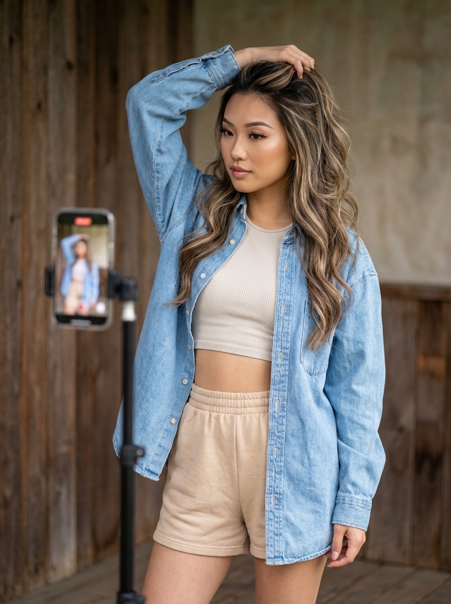 {"scene_description": "A vertical lifestyle portrait of a young model posing for a content creation setup, standing behind a tripod-mounted smartphone while adjusting her hair against a rustic wooden backdrop.", "subject": {"type": "young model", "age": "early 20s", "features": {"hair": "long wavy hair with balayage highlights, voluminous and swept to one side", "expression": "neutral, serene expression with a soft gaze towards the lens", "other": "flawless makeup, manicured nails, poised demeanor"}, "attire": "ribbed crop top , unbuttoned oversized light blue denim shirt worn as a jacket, light tan elastic-waist shorts", "position": "standing upright, right arm raised with hand gently touching the top of her head, body angled slightly"}, "action": {"primary": "posing for a selfie or video recording", "secondary": "hand running through hair", "effect": "creating a casual yet curated social media aesthetic"}, "environment": {"setting": "semi-outdoor space or balcony with rustic wooden walls", "foreground_elements": ["tripod stand with a mounted smartphone", "smartphone in a clear case with triple-lens camera array facing the viewer"], "background": "vertical wooden paneling with natural wood grain texture"}, "lighting": {"style": "natural soft outdoor lighting", "key_light": {"type": "diffused ambient light", "color": "warm natural tones", "illuminates": ["subject's face evenly", "highlights on hair waves", "soft reflection on phone case"]}, "background_light": {"color": "neutral wood tones"}, "shadows": "soft and minimal, emphasizing flattering portraiture"}, "style": {"medium": "Digital Photography (Canon EOS R5 simulation)", "aesthetic": "modern influencer lifestyle, high-quality social media content", "quality": "high resolution, sharp focus", "details": "realistic fabric textures on denim and ribbing on top"}, "scene_composition": {"subject_action": "subject-centered but partially obscured by foreground tripod", "camera_behavior": "eye-level shot capturing the subject capturing herself", "depth_layering": "sharp foreground phone/tripod, sharp subject, slightly softer background wall."}, "visual_description": {"core_subject": "A stylish individual creating content with a relaxed vibe.", "attire_physics": "denim shirt hangs loosely, hair falls naturally with volume.", "skin_rendering": "smooth and luminous with natural skin tones."}, "lighting_and_atmosphere": {"type": "Casual Intimate Atmosphere", "specifics": "even daylight without harsh contrast", "color_grade": "warm natural color palette, slightly desaturated blues and tans"}, "attire_customization": {"current_clothing": "light blue denim shirt, crop top , tan shorts", "customizable_clothing": "linen button-down or silk robe for different textures"}, "brand_product_customization": {"current_brand_product": "iPhone-style smartphone with triple camera layout", "customizable_brand": "Generic smartphone", "customizable_product": "Tripod setup", "product_placement_area": "Prominent in immediate foreground"}, "objects_and_props": {"main_objects": ["smartphone on tripod", "silver if(gender=f){hoop earrings } ", "delicate pendant necklace"], "secondary_objects": ["wooden wall structure"]}, "camera_and_lens": {"focal_length_feel": "50mm f/1.2 lens simulation", "aperture_effect": "shallow depth of field isolating subject and equipment from the wall", "camera_angle": "straight on, slightly offset from the tripod's line of sight", "lens_type": "Prime portrait lens", "bokeh_style": "subtle softness on the wooden texture behind"}}