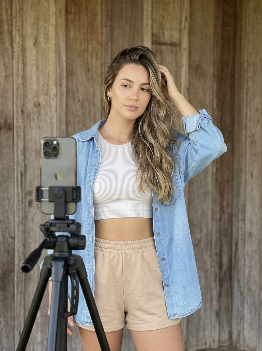 {"scene_description": "A vertical lifestyle portrait of a young model posing for a content creation setup, standing behind a tripod-mounted smartphone while adjusting her hair against a rustic wooden backdrop.", "subject": {"type": "young model", "age": "early 20s", "features": {"hair": "long wavy hair with balayage highlights, voluminous and swept to one side", "expression": "neutral, serene expression with a soft gaze towards the lens", "other": "flawless makeup, manicured nails, poised demeanor"}, "attire": "ribbed crop top , unbuttoned oversized light blue denim shirt worn as a jacket, light tan elastic-waist shorts", "position": "standing upright, right arm raised with hand gently touching the top of her head, body angled slightly"}, "action": {"primary": "posing for a selfie or video recording", "secondary": "hand running through hair", "effect": "creating a casual yet curated social media aesthetic"}, "environment": {"setting": "semi-outdoor space or balcony with rustic wooden walls", "foreground_elements": ["tripod stand with a mounted smartphone", "smartphone in a clear case with triple-lens camera array facing the viewer"], "background": "vertical wooden paneling with natural wood grain texture"}, "lighting": {"style": "natural soft outdoor lighting", "key_light": {"type": "diffused ambient light", "color": "warm natural tones", "illuminates": ["subject's face evenly", "highlights on hair waves", "soft reflection on phone case"]}, "background_light": {"color": "neutral wood tones"}, "shadows": "soft and minimal, emphasizing flattering portraiture"}, "style": {"medium": "Digital Photography (Canon EOS R5 simulation)", "aesthetic": "modern influencer lifestyle, high-quality social media content", "quality": "high resolution, sharp focus", "details": "realistic fabric textures on denim and ribbing on top"}, "scene_composition": {"subject_action": "subject-centered but partially obscured by foreground tripod", "camera_behavior": "eye-level shot capturing the subject capturing herself", "depth_layering": "sharp foreground phone/tripod, sharp subject, slightly softer background wall."}, "visual_description": {"core_subject": "A stylish individual creating content with a relaxed vibe.", "attire_physics": "denim shirt hangs loosely, hair falls naturally with volume.", "skin_rendering": "smooth and luminous with natural skin tones."}, "lighting_and_atmosphere": {"type": "Casual Intimate Atmosphere", "specifics": "even daylight without harsh contrast", "color_grade": "warm natural color palette, slightly desaturated blues and tans"}, "attire_customization": {"current_clothing": "light blue denim shirt, crop top , tan shorts", "customizable_clothing": "linen button-down or silk robe for different textures"}, "brand_product_customization": {"current_brand_product": "iPhone-style smartphone with triple camera layout", "customizable_brand": "Generic smartphone", "customizable_product": "Tripod setup", "product_placement_area": "Prominent in immediate foreground"}, "objects_and_props": {"main_objects": ["smartphone on tripod", "silver if(gender=f){hoop earrings } ", "delicate pendant necklace"], "secondary_objects": ["wooden wall structure"]}, "camera_and_lens": {"focal_length_feel": "50mm f/1.2 lens simulation", "aperture_effect": "shallow depth of field isolating subject and equipment from the wall", "camera_angle": "straight on, slightly offset from the tripod's line of sight", "lens_type": "Prime portrait lens", "bokeh_style": "subtle softness on the wooden texture behind"}}