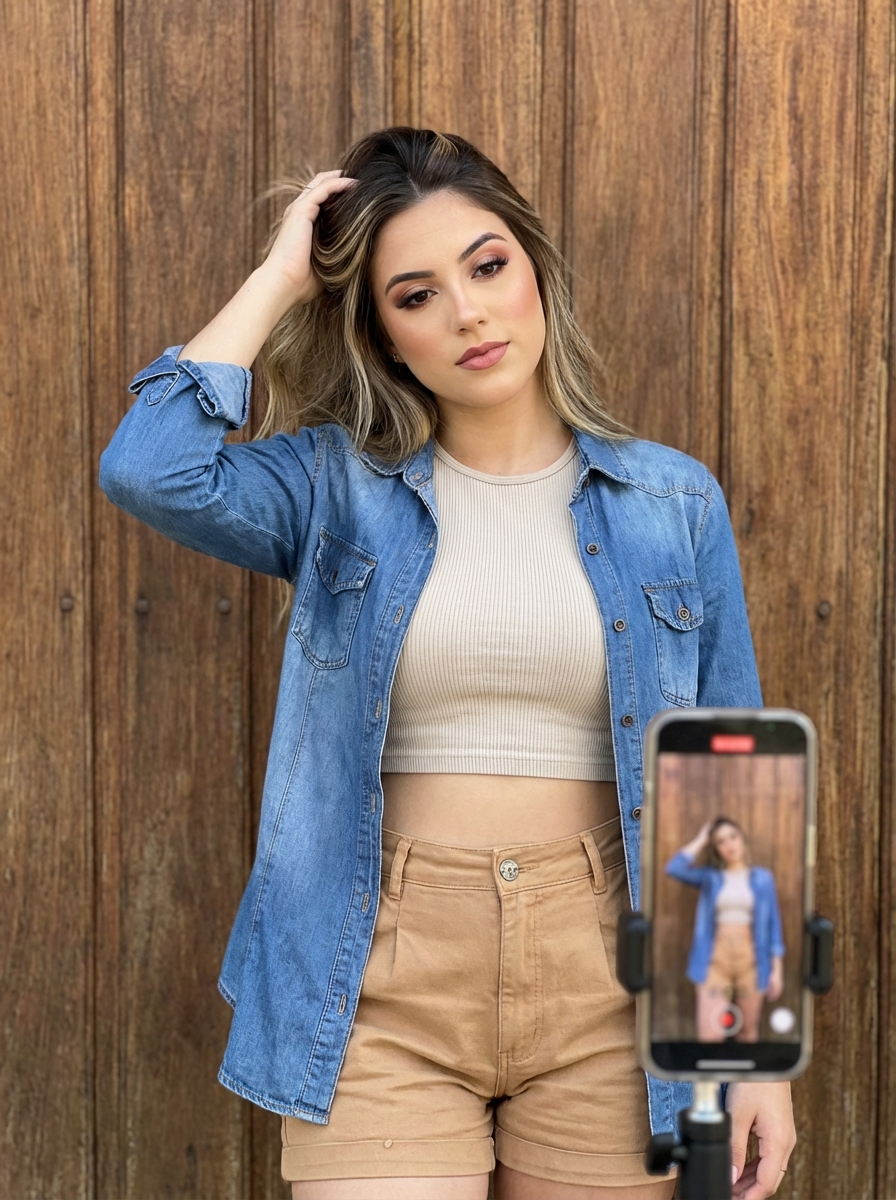 {"scene_description": "A vertical lifestyle portrait of a young model posing for a content creation setup, standing behind a tripod-mounted smartphone while adjusting her hair against a rustic wooden backdrop.", "subject": {"type": "young model", "age": "early 20s", "features": {"hair": "long wavy hair with balayage highlights, voluminous and swept to one side", "expression": "neutral, serene expression with a soft gaze towards the lens", "other": "flawless makeup, manicured nails, poised demeanor"}, "attire": "ribbed crop top , unbuttoned oversized light blue denim shirt worn as a jacket, light tan elastic-waist shorts", "position": "standing upright, right arm raised with hand gently touching the top of her head, body angled slightly"}, "action": {"primary": "posing for a selfie or video recording", "secondary": "hand running through hair", "effect": "creating a casual yet curated social media aesthetic"}, "environment": {"setting": "semi-outdoor space or balcony with rustic wooden walls", "foreground_elements": ["tripod stand with a mounted smartphone", "smartphone in a clear case with triple-lens camera array facing the viewer"], "background": "vertical wooden paneling with natural wood grain texture"}, "lighting": {"style": "natural soft outdoor lighting", "key_light": {"type": "diffused ambient light", "color": "warm natural tones", "illuminates": ["subject's face evenly", "highlights on hair waves", "soft reflection on phone case"]}, "background_light": {"color": "neutral wood tones"}, "shadows": "soft and minimal, emphasizing flattering portraiture"}, "style": {"medium": "Digital Photography (Canon EOS R5 simulation)", "aesthetic": "modern influencer lifestyle, high-quality social media content", "quality": "high resolution, sharp focus", "details": "realistic fabric textures on denim and ribbing on top"}, "scene_composition": {"subject_action": "subject-centered but partially obscured by foreground tripod", "camera_behavior": "eye-level shot capturing the subject capturing herself", "depth_layering": "sharp foreground phone/tripod, sharp subject, slightly softer background wall."}, "visual_description": {"core_subject": "A stylish individual creating content with a relaxed vibe.", "attire_physics": "denim shirt hangs loosely, hair falls naturally with volume.", "skin_rendering": "smooth and luminous with natural skin tones."}, "lighting_and_atmosphere": {"type": "Casual Intimate Atmosphere", "specifics": "even daylight without harsh contrast", "color_grade": "warm natural color palette, slightly desaturated blues and tans"}, "attire_customization": {"current_clothing": "light blue denim shirt, crop top , tan shorts", "customizable_clothing": "linen button-down or silk robe for different textures"}, "brand_product_customization": {"current_brand_product": "iPhone-style smartphone with triple camera layout", "customizable_brand": "Generic smartphone", "customizable_product": "Tripod setup", "product_placement_area": "Prominent in immediate foreground"}, "objects_and_props": {"main_objects": ["smartphone on tripod", "silver if(gender=f){hoop earrings } ", "delicate pendant necklace"], "secondary_objects": ["wooden wall structure"]}, "camera_and_lens": {"focal_length_feel": "50mm f/1.2 lens simulation", "aperture_effect": "shallow depth of field isolating subject and equipment from the wall", "camera_angle": "straight on, slightly offset from the tripod's line of sight", "lens_type": "Prime portrait lens", "bokeh_style": "subtle softness on the wooden texture behind"}}