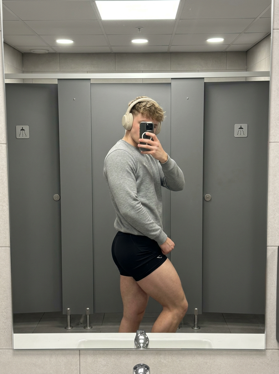 {"scene_description":"A casual, fitness-focused mirror selfie of a young model posing in a side profile within a modern locker room or restroom setting.","subject":{"type":"young model ","age":"early 20s","features":{"hair":"light hair styled in a short textured cut or tousled style with strands falling naturally","expression":"obscured by the smartphone, implying anonymity and focus on the physique","other":"toned, athletic muscular physique."},"attire":"long-sleeve fitted sweatshirt paired with tight-fitting athletic gym shorts","position":"standing in profile, twisting the towards the mirror to accentuate physique, with one leg slightly bent"},"action":{"primary":"taking a mirror selfie with a smartphone held in the right hand","secondary":"posing to showcase the fitness outfit and physique","effect":"capturing a 'gym fit check' or casual lifestyle moment"},"environment":{"setting":"modern public restroom or gym locker room","foreground_elements":["bathroom mirror reflection","sink faucet at the very bottom edge."],"background":"matte grey stall doors and tiled walls, typical of institutional or gym architecture"},"lighting":{"style":"soft overhead artificial lighting","key_light":{"type":"fluorescent or LED ceiling fixtures","color":"neutral white","illuminates":["the subject clearly from above","soft highlights on the hair and headphones"]},"background_light":{"color":"flat grey ambient light"},"shadows":"soft, diffuse shadows defining body contours"},"style":{"medium":"Smartphone Photography (Mirror Selfie)","aesthetic":"social media lifestyle, athleisure, casual gym aesthetic","quality":"sharp smartphone resolution","details":"texture of the cotton sweatshirt versus the smooth spandex shorts"},"scene_composition":{"subject_action":"centered vertical framing","camera_behavior":"mirror reflection perspective","depth_layering":"subject clearly defined against the flat, geometric background of the stalls."},"visual_description":{"core_subject":"A trendy guy capturing a daily routine moment.","attire_physics":"loose fit of the fitted t-shirt contrasting with the skin-tight fit of the shorts.","skin_rendering":"smooth and groomed skin naturally lit by indoor lighting."},"lighting_and_atmosphere":{"type":"Indoor Functional","specifics":"Clean and neutral environment","color_grade":"Desaturated cool tones (greys and blacks) with the subject's skin and hair providing warmth."},"attire_customization":{"current_clothing":"fitted sweatshirt and shorts","customizable_clothing":"oversized hoodie or matching gym set."},"brand_product_customization":{"current_brand_product":"Smartphone (iPhone style), Over-ear headphones","customizable_brand":"N\/A","customizable_product":"Headphones color","product_placement_area":"Head\/Ears"},"objects_and_props":{"main_objects":["Smartphone in case","Cream\/beige over-ear headphones"],"secondary_objects":["Stall door icons (shower symbols)"]},"camera_and_lens":{"focal_length_feel":"26mm equivalent (smartphone main camera)","aperture_effect":"wide depth of field keeping background stalls recognized","camera_angle":"Eye-level mirror reflection","lens_type":"Wide-angle smartphone lens","bokeh_style":"None"}}
