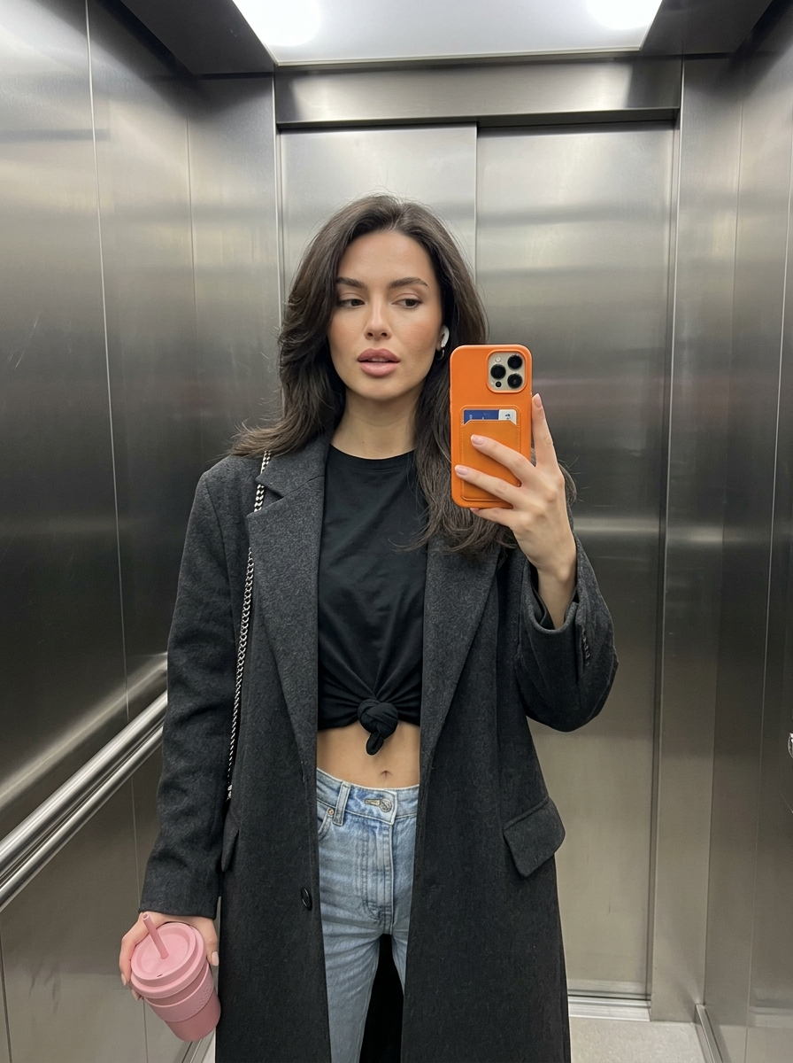 {"scene_description":"A chic, candid mirror selfie taken inside a brushed-metal elevator by a stylish young model radiating a 'model-off-duty' aesthetic.","subject":{"type":"young ","age":"early 20s","features":{"hair":"long, voluminous hair with layers and a soft blowout texture, draped over shoulders","expression":"sultry and confident with slightly parted lips and a relaxed, heavy-lidded gaze","other":"refined features with high cheekbones, brushed-up eyebrows, soft natural glam makeup , and a wireless earbud in the right ear."},"attire":"oversized tailored coat\/blazer worn over a t-shirt knotted at the waist to reveal the midriff, paired with light-wash denim jeans","position":"standing facing the elevator mirror, holding a phone up with the right hand and a drink in the left"},"action":{"primary":"taking a mirror selfie with a smartphone","secondary":"holding a pink beverage cup with a straw in the left hand","effect":"capturing a casual yet curated lifestyle moment"},"environment":{"setting":"modern elevator interior","foreground_elements":["orange smartphone case with a card holder","pink beverage cup","silver chain bag strap"],"background":"brushed stainless steel elevator doors with horizontal paneling and subtle reflections."},"lighting":{"style":"diffused artificial interior lighting","key_light":{"type":"overhead elevator lighting","color":"neutral to cool white","illuminates":["even lighting on the face creating soft womaning","highlights on the hair and metallic background"]},"background_light":{"color":"metallic grey tones from the steel reflection"},"shadows":"soft, minimal shadows indicating diffuse light sources"},"style":{"medium":"Smartphone Photography (iPhone mirror selfie)","aesthetic":"influencer lifestyle, street style, casual chic","quality":"high-definition social media snapshot","details":"realistic skin texture, fabric folds on the knotted shirt, and metallic sheen of the elevator"},"scene_composition":{"subject_action":"centered vertical framing typical of mobile selfies","camera_behavior":"eye-level reflection","depth_layering":"subject clearly defined in foreground against a flat, textured metallic background."},"visual_description":{"core_subject":"A fashionable young model capturing her outfit in a mundane setting turned stylish.","attire_physics":"stiff structure of the coat contrasting with the soft drape of the knotted cotton tee.","skin_rendering":"smooth, flawless complexion with soft highlighting on the nose and cheekbones."},"lighting_and_atmosphere":{"type":"Urban Interior","specifics":"Clean, modern, and slightly cool-toned","color_grade":"Natural colors with a pop of orange from the phone case."},"attire_customization":{"current_clothing":"blazer, knotted tee, jeans","customizable_clothing":"leather jacket or oversized hoodie."},"brand_product_customization":{"current_brand_product":"iPhone-style smartphone with orange case, wireless earbud","customizable_brand":"Phone brand","customizable_product":"Beverage cup","product_placement_area":"Hands"},"objects_and_props":{"main_objects":["Orange smartphone with card holder"],"secondary_objects":["Pink drink cup with straw","Silver chain bag strap"]},"camera_and_lens":{"focal_length_feel":"26mm equivalent (smartphone main camera)","aperture_effect":"deep depth of field keeping both subject and background relatively sharp","camera_angle":"Eye-level mirror reflection","lens_type":"Wide-angle smartphone lens","bokeh_style":"None\/Minimal"}}