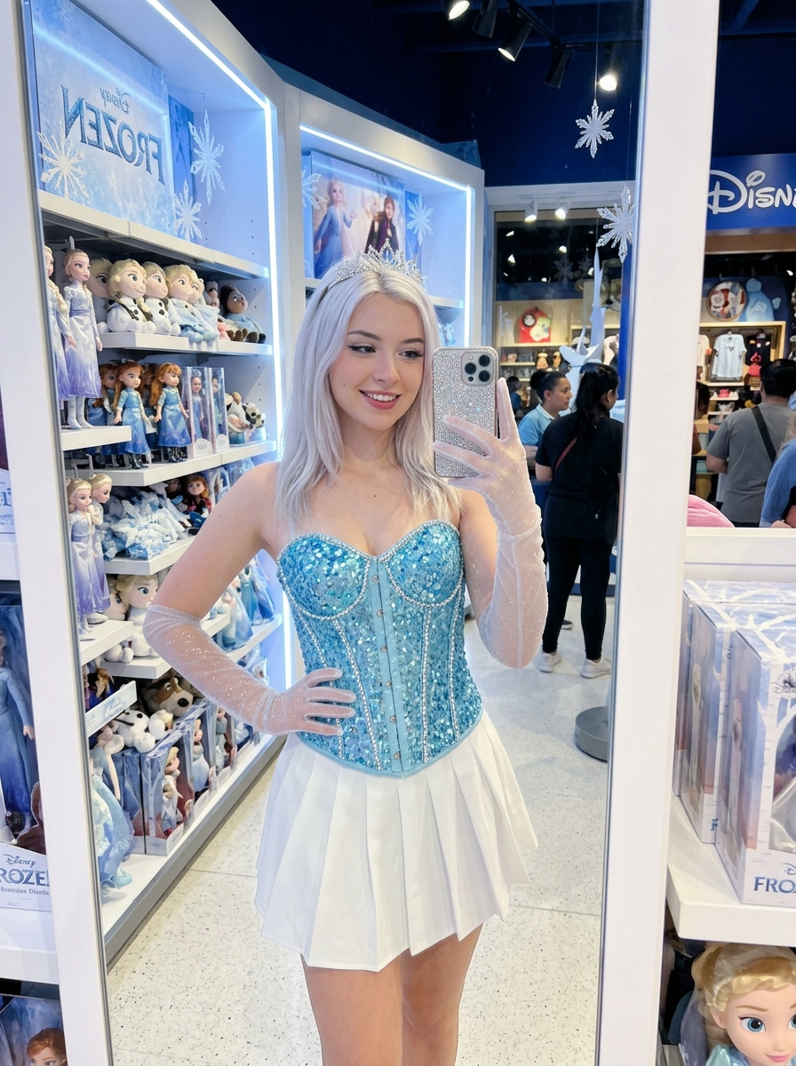 {"scene_description":"A dazzling, icy-themed mirror selfie of a stylish young model in a Disney store, channeling a modern Frozen aesthetic.","image_reference":{"path":"[UPLOADED_IMAGE]","weight":"high","influence":"face_and_body_structure"},"subject":{"type":"the model from the uploaded image","age":"match input image","features":{"hair":"loose platinum or cool-toned waves cascading over shoulders","expression":"elegant smile, confident gaze into the mirror","makeup":"shimmering silver eyeshadow , cool-toned highlighter , glossy pink lips "},"attire":"a shimmering icy-blue corset top with intricate sequin detailing, a crisp pleated if(gender=f){tennis skirt } , and sheer glittery opera gloves","accessories":"a delicate silver crystal tiara, a rhinestone-encrusted phone case, a small Olaf plushie resting on the counter","position":"standing elegantly with one hand on hip, holding phone with the other"},"action":{"primary":"taking a glamour shot in the mirror","secondary":"showcasing the sparkle of the outfit","effect":"glitter and sequins catching the light beautifully"},"environment":{"setting":"Disney store Frozen section","foreground_elements":["sparkly phone case","glass mirror surface","snowflake decorations"],"background_elements":["shelves filled with blue and merchandise","castle displays","cool-toned LED retail lighting"]},"lighting":{"style":"Cool and Crisp High-Key","key_light":{"type":"Cool softbox simulation","color":"Ice blue\/White","illuminates":"the sequins on the corset and the subject's face"},"background_light":{"color":"Soft cyan backlighting"},"shadows":"sharp, crisp reflections"},"style":{"medium":"Smartphone photography","aesthetic":"Ice Princess Core, Luxury Teen, Sparkle Filter","quality":"8k resolution, texture-focused (sequins\/glitter)","details":"ultra-detailed fabric textures"},"visual_description":{"core_subject":"A modern interpretation of a winter princess with high-fashion streetwear elements.","attire_physics":"The corset structure fits tightly, while the skirt pleats fall perfectly.","skin_rendering":"Porcelain smooth skin with a cold-weather flush."},"lighting_and_atmosphere":{"type":"Winter Wonderland Indoors","specifics":"Lens flares from the sequins (star filter effect)","color_grade":"Cool blues, silvers, and crisp whites"},"attire_customization":{"current_clothing":"Icy-blue sequin corset, if(gender=f){tennis skirt } , glitter gloves","customizable_clothing":"Can be swapped for a long blue satin gown for a more formal look"},"camera_and_lens":{"focal_length_feel":"24mm Smartphone Wide","aperture_effect":"f\/1.8","camera_angle":"Eye-level mirror reflection","lens_type":"Modern digital lens","bokeh_style":"Sparkly bokeh in background"}}