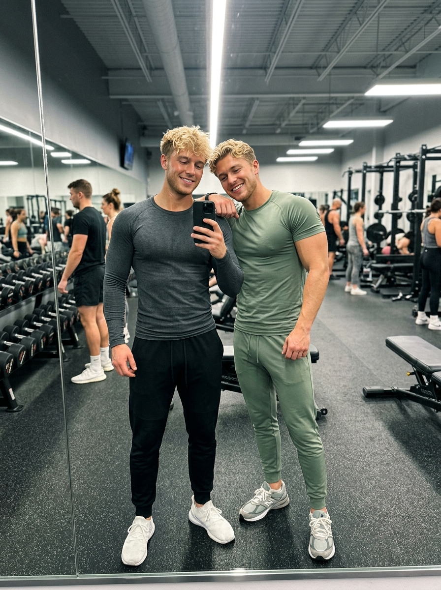 {"scene_description":"A high-energy, social media-style mirror selfie of two fit blonde best bros posing together in a busy, modern mixed-gender gym.","subject":{"type":"two young men","age":"early 20s","features":{"hair":"both have short styled hair; the selfie-taker has messy tousled short hair, the friend has short wavy hair","expression":"both smiling confidently at the mirror reflection, making eye contact with the viewer through the reflection","other":"glowing skin with a light post-workout sheen, groomed skin with light stubble."},"attire":"Selfie-taker (left): long-sleeve ribbed fitted t-shirt and seamless joggers. Friend (right): matching sage green fitted athletic top and joggers set","position":"standing side-by-side in front of a large gym mirror; selfie-taker is slightly forward, holding the phone, friend is leaning in close with a confident playful pose."},"action":{"primary":"taking a collaborative mirror selfie","secondary":"posing to highlight their fitness progress","effect":"capturing a fun, motivating workout moment between friends"},"environment":{"setting":"spacious, well-lit modern gym floor","foreground_elements":["large wall-to-wall mirror","dumbbells on a rack at the edge"],"background":"blurred view of the gym behind them, showing gym equipment and a mixed group of men and women working out in the distance"},"lighting":{"style":"bright, cool-toned commercial gym lighting","key_light":{"type":"overhead fluorescent strips","color":"clean white","illuminates":["even lighting on both faces","highlights on the gym equipment in the background"]},"background_light":{"color":"daylight mixing with interior lights"},"shadows":"minimal soft shadows, ensuring faces are bright and clear."},"style":{"medium":"Smartphone Photography (Mirror Selfie)","aesthetic":"fitness influencer, lifestyle, energetic","quality":"high-definition, vibrant colors, sharp focus on the subjects","details":"fabric textures of the activewear, reflection clarity, gym atmosphere"},"scene_composition":{"subject_action":"dual subject framing, centered in the mirror","camera_behavior":"eye-level reflection capture","depth_layering":"sharp foreground subjects against a bokeh\/blurred background of the busy gym."},"visual_description":{"core_subject":"Two blonde fitness enthusiasts documenting their session.","attire_physics":"athletic wear fitting snugly, showcasing lean muscular builds.","skin_rendering":"healthy, radiant complexion."},"lighting_and_atmosphere":{"type":"Active Gym Environment","specifics":"Energetic and social atmosphere","color_grade":"Bright, high-contrast, slightly cool tones typical of fitness photography."},"attire_customization":{"current_clothing":"fitted t-shirt\/joggers (taker), green fitted athletic top and joggers set (friend)","customizable_clothing":"matching sets in different colors"},"brand_product_customization":{"current_brand_product":"Smartphone","customizable_brand":"N\/A","customizable_product":"Gym equipment brands","product_placement_area":"Background"},"objects_and_props":{"main_objects":["Smartphone"],"secondary_objects":["Gym weights","Benches"]},"camera_and_lens":{"focal_length_feel":"24mm wide angle (smartphone)","aperture_effect":"f\/2.8 keeping subjects sharp","camera_angle":"Mirror reflection","lens_type":"Smartphone lens","bokeh_style":"Slight background blur"}}