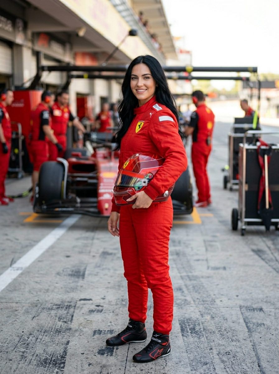 {"scene_description":"A premium, vibrant commercial portrait of an extremely beautiful and captivating model racing driver in a Ferrari Formula 1 pit lane. She smiles warmly while holding a Ferrari racing helmet. A Ferrari F1 car and Ferrari crew are in the background in soft focus.","subject":{"type":"young model","age":"early 20s","appearance":{"hair":"long, glossy jet-hair, slightly wavy, flowing over the shoulders","eyes":"bright blue eyes","makeup":"glamorous smokey eye makeup, defined lashes , sculpted brows, subtle contour , soft -pink lipstick ","expression":"bright genuine smile with teeth; confident, friendly, inviting","skin":"natural healthy glow, realistic skin texture (not plastic)"},"attire":{"outfit":"Ferrari F1-style racing suit in iconic Ferrari red with accents, tailored fit","branding":"Ferrari shield-style patch ; keep sponsor patches minimal and realistic-looking readable text"},"pose":{"body":"standing, turned slightly sideways","head":"looking back over her left shoulder toward the camera","hands":"left hand holding a Ferrari helmet at hip level; right arm relaxed"}},"props":{"helmet":"Ferrari racing helmet with a glossy finish, subtle geometric striping, and an iridescent mirrored visor"},"environment":{"setting":"Formula 1 pit lane \/ paddock","background":{"main":"a red Ferrari Formula 1 car parked behind her (clearly recognizable silhouette, soft focus)","secondary":"Ferrari crew members in red uniforms, pit garage structures, equipment trolleys","depth_of_field":"strong background blur while preserving recognizable Ferrari context"}},"lighting":{"style":"bright natural daylight, clean high-end commercial look","key_light":"diffused sunlight with warm highlights on face and hair","shadows":"soft flattering shadows, open shade feel","reflections":"realistic reflections on helmet visor and suit fabric"},"style":{"medium":"high-end digital portrait photography","aesthetic":"premium sports lifestyle, Ferrari F1 vibe","quality":"ultra high resolution, sharp focus on face and eyes, vibrant natural colors","details":" suit fabric weave, realistic stitching, embroidered patch texture, clean bokeh"},"composition":{"camera_angle":"eye-level","framing":"3\/4 body portrait with helmet fully ","depth":"shallow depth of field, subject dominates the frame"},"camera_and_lens":{"lens":"telephoto prime","focal_length_feel":"85mm to 105mm","aperture":"f\/2.0 to f\/2.8","bokeh":"smooth creamy bokeh"},"negative_prompt":["low resolution","blurry face","over-smoothed plastic skin","bad anatomy","extra fingers","deformed hands","warped helmet visor","gibberish text","messy or unreadable logos","incorrect team colors (no blue suit)","cartoon","anime","illustration","overexposed highlights","underexposed shadows","duplicate foreground people"]}