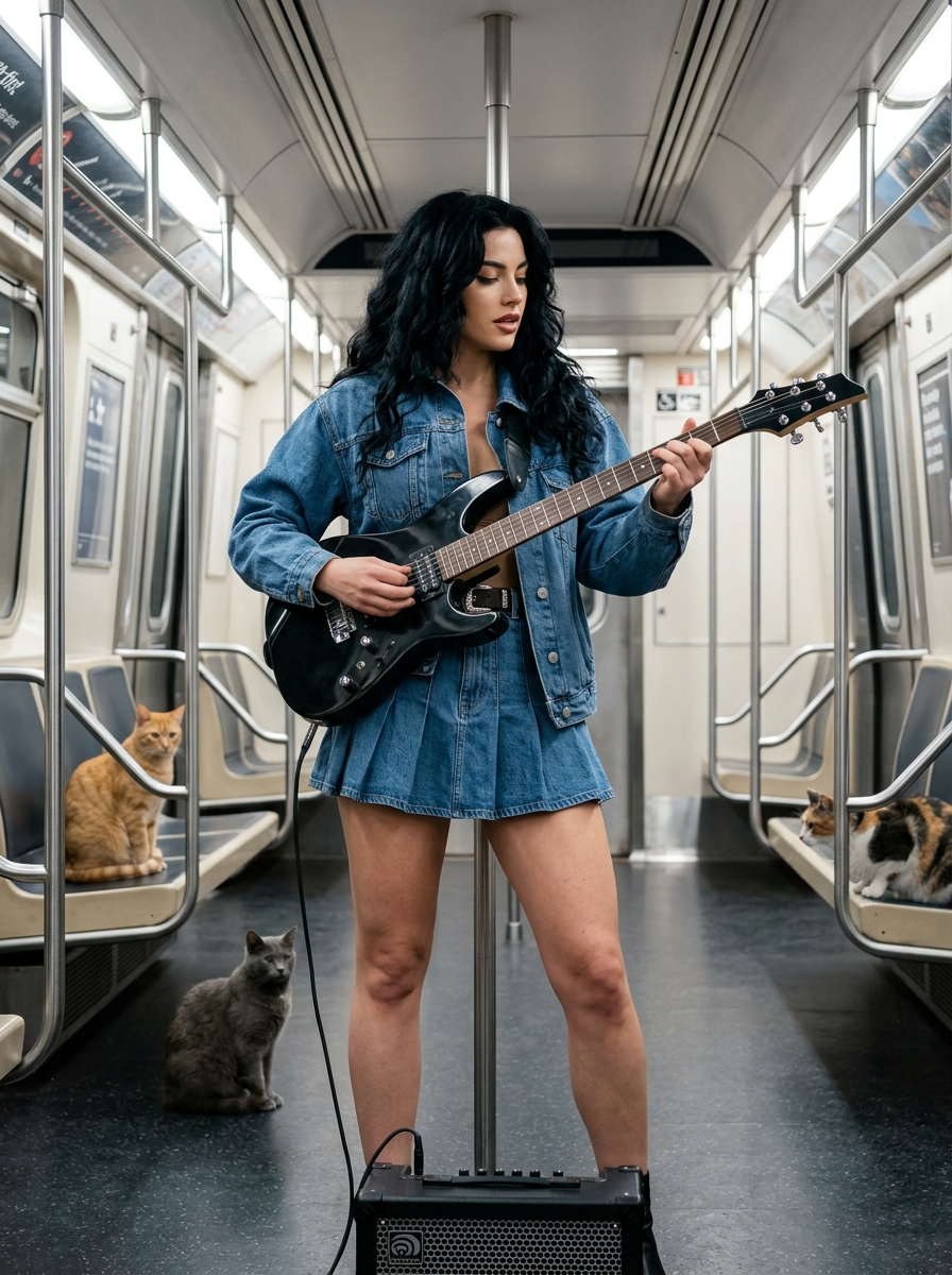 {"scene_description":"A striking, ultra-stylish young model performs a mini subway concert in the center aisle of an empty, sleek New York City subway car\u2014an edgy streetwear editorial moment with a electric guitar in her hands, plus a few cats of different colors calmly present in the subway car.","subject":{"type":"young model","age":"early 20s","features":{"hair":"jet-black, very voluminous, thick glamorous waves with lots of lift at the crown (no hat\/cap)","expression":"captivating, confident, slightly sultry gaze with parted lips (tasteful)","makeup":"smoky eye makeup with clean blending, smudged liner, long lashes , subtle contour , natural skin texture (no beauty filter)"},"attire":"denim jacket (slightly oversized, structured shoulders, premium denim texture), mini pleated denim skirt (crisp pleats, high waist), fitted blouse \/top, leather belt with polished silver buckle","props":"sleek electric guitar held and played naturally (right hand strumming\/picking, left hand on fretboard), guitar strap optional but realistic if used","position":"standing centered in the aisle, confident stance, slight hip shift, performance posture"},"action":{"primary":"playing a electric guitar like a mini subway concert","secondary":"performing confidently for the camera","effect":"magnetic rockstar energy, fashionable, bold, and compelling"},"environment":{"setting":"interior of a sleek subway car","foreground_elements":["brushed metal vertical handrails with crisp reflections","dark speckled floor"],"background":"rows of matte seats and dark wall panels lining both sides, minimal signage, vanishing point perspective down the car","concert_vibe_details":["subtle portable amp or small speaker near her feet (minimal, realistic)"],"animals":{"rule":"Include a few cats of different colors in the subway car, placed naturally and realistically, cluttering the scene.","count":"3 to 5 cats","cat_colors":["cat","orange tabby cat","cat","gray cat"],"placement":["one cat sitting on a seat","one cat on the floor near a pole","one cat near the aisle edge watching the guitar"],"behavior":"calm, curious, non-aggressive, realistic anatomy and fur"},"cleanliness":"empty, clean, no graffiti, no clutter"},"lighting":{"style":"ambient interior subway lighting with a slightly cinematic performance feel","key_light":{"type":"overhead tube lighting","color":"neutral-to-cool white","illuminates":["even illumination on the face with flattering catchlights","controlled highlights on denim textures","clean specular highlights on metal poles and guitar finish","soft highlights on cat fur"]},"shadows":"soft, diffused shadows under the chin and in jacket folds, consistent direction"},"style":{"medium":"Professional mirrorless\/DSLR digital photography","aesthetic":"Urban streetwear editorial, Y2K revival, refined rock-chic performance","quality":"ultra high resolution, sharp focus, deep depth of field","details":"real denim weave, crisp skirt pleats, realistic belt hardware, natural pores, realistic guitar reflections, realistic cat fur detail"},"scene_composition":{"subject_action":"centered subject with strong leading lines from the subway interior","camera_behavior":"eye-level shot emphasizing symmetry and perspective","depth_layering":"subject separated by contrast and leading lines; background readable; cats but not blocking the subject"},"lighting_and_atmosphere":{"type":"Urban Interior","specifics":"bright, even subway lighting, premium editorial clarity","color_grade":"cool monochrome blacks with subtle metallic highlights, clean skin tones"},"camera_and_lens":{"focal_length_feel":"35mm wide angle to capture the environment","aperture_effect":"f\/4 to f\/5.6, keeping subject and subway interior sharp","camera_angle":"straight-on eye level","lens_type":"standard wide lens","bokeh_style":"minimal bokeh, deep focus"},"negative_prompt":["hat","cap","blurry face","low resolution","plastic skin","beauty filter","over-smoothed skin","warped hands","extra fingers","deformed anatomy","floating guitar","guitar merged into body","incorrect guitar grip","wrong perspective","inconsistent lighting","multiple shadow directions","overexposed face","harsh under-eye shadows","graffiti clutter","dirty subway","extra people","cats with deformed anatomy","extra legs on cats","cats fused into seats","floating cats","text","watermark","logo","cartoon","anime","cgi render"]}