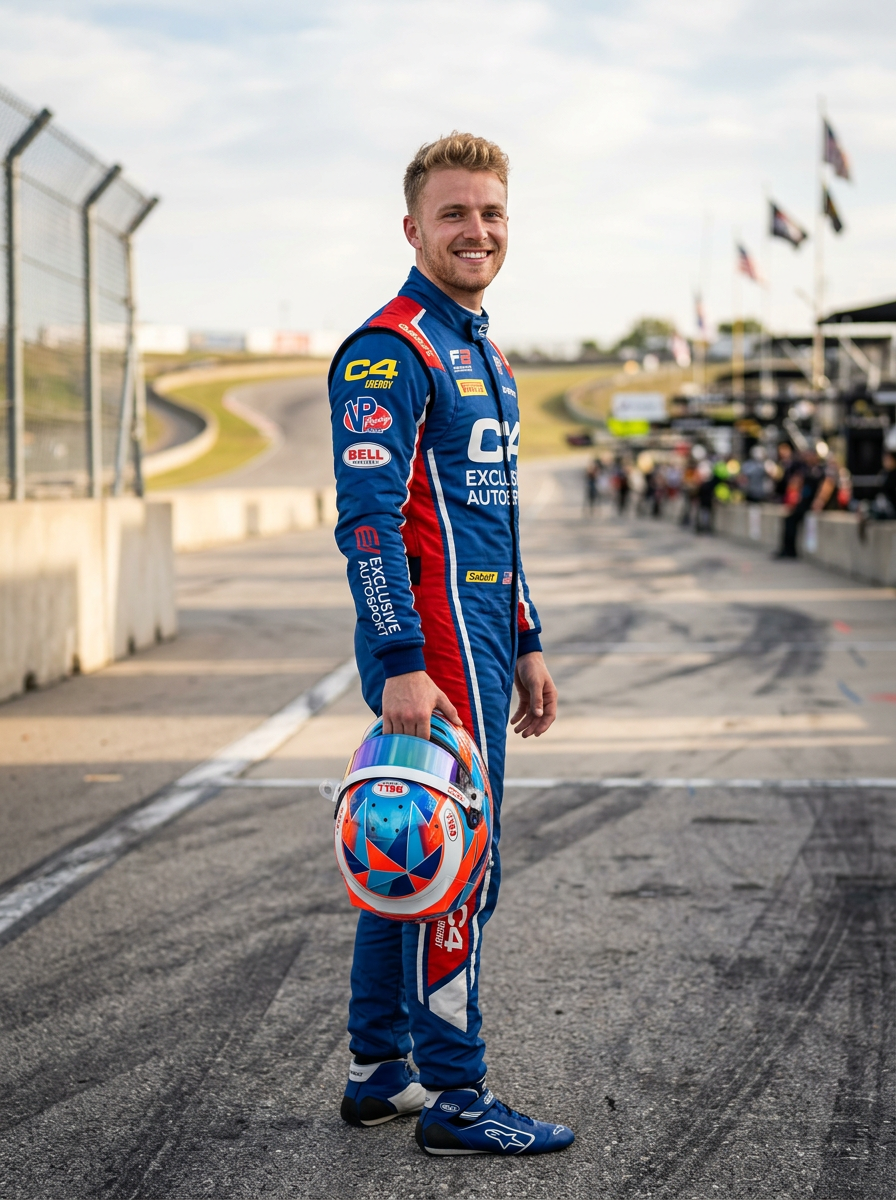 {"scene_description":"A vibrant and cheerful portrait of a model racing driver smiling warmly while holding his helmet on a race track.","subject":{"type":"young male ","age":"early 20s","features":{"hair":"short, blonde, textured hair","expression":"bright, genuine smile with teeth, exuding approachability and joy","other":"light stubble, natural features, blue eyes."},"attire":"blue racing suit with and red accents, featuring sponsor logos like 'C4 Energy', 'VP Racing Fuels', 'Bell', and 'Exclusive Autosport'","position":"standing with body turned slightly sideways, looking back over the left shoulder at the camera."},"action":{"primary":"smiling directly at the camera","secondary":"holding a colorful racing helmet in the left hand at hip level","effect":"creating a friendly and inviting atmosphere amidst a competitive setting"},"environment":{"setting":"outdoor race track","foreground_elements":["subject's racing helmet with vibrant geometric patterns"],"background":"blurred concrete barriers and track infrastructure in soft focus"},"lighting":{"style":"bright natural daylight","key_light":{"type":"sunlight","color":"warm daylight","illuminates":["the subject's face and hair, creating a soft halo effect","highlights on the racing suit fabric"]},"background_light":{"color":"soft, diffused daylight blue\/grey tones"},"shadows":"soft, flattering shadows indicating open shade or diffused sun"},"style":{"medium":"Digital Portrait Photography","aesthetic":"Commercial sports lifestyle, bright and positive","quality":"high-resolution with vibrant colors and sharp focus on the face","details":"texture of the racing suit patches, reflections on the helmet visor"},"scene_composition":{"subject_action":"profile turn towards camera, using the 'looking back' pose","camera_behavior":"eye-level, capturing an engaging and personal moment","depth_layering":"shallow depth of field separating the sharp subject from the indistinct background."},"visual_description":{"core_subject":"A charismatic athlete radiating positivity.","attire_physics":"structured fit of the racing suit with natural folds at the waist.","skin_rendering":"smooth, sun-lit skin with a healthy glow."},"lighting_and_atmosphere":{"type":"Outdoor Daytime Sports","specifics":"Clean, high-key lighting emphasizing clarity and color","color_grade":"Natural and vibrant, enhancing the blues of the suit and hair."},"attire_customization":{"current_clothing":"blue\/white\/red racing suit","customizable_clothing":"different team livery colors."},"brand_product_customization":{"current_brand_product":"C4 Energy, VP Racing, Bell Helmets","customizable_brand":"Suit logos","customizable_product":"Helmet design","product_placement_area":"Shoulder, chest, and helmet"},"objects_and_props":{"main_objects":["Racing helmet with iridescent visor"],"secondary_objects":["Concrete track barriers"]},"camera_and_lens":{"focal_length_feel":"85mm or 105mm portrait lens","aperture_effect":"f\/2.0 to f\/2.8 for creamy bokeh","camera_angle":"Eye-level","lens_type":"Telephoto prime","bokeh_style":"Smooth background blur"}}