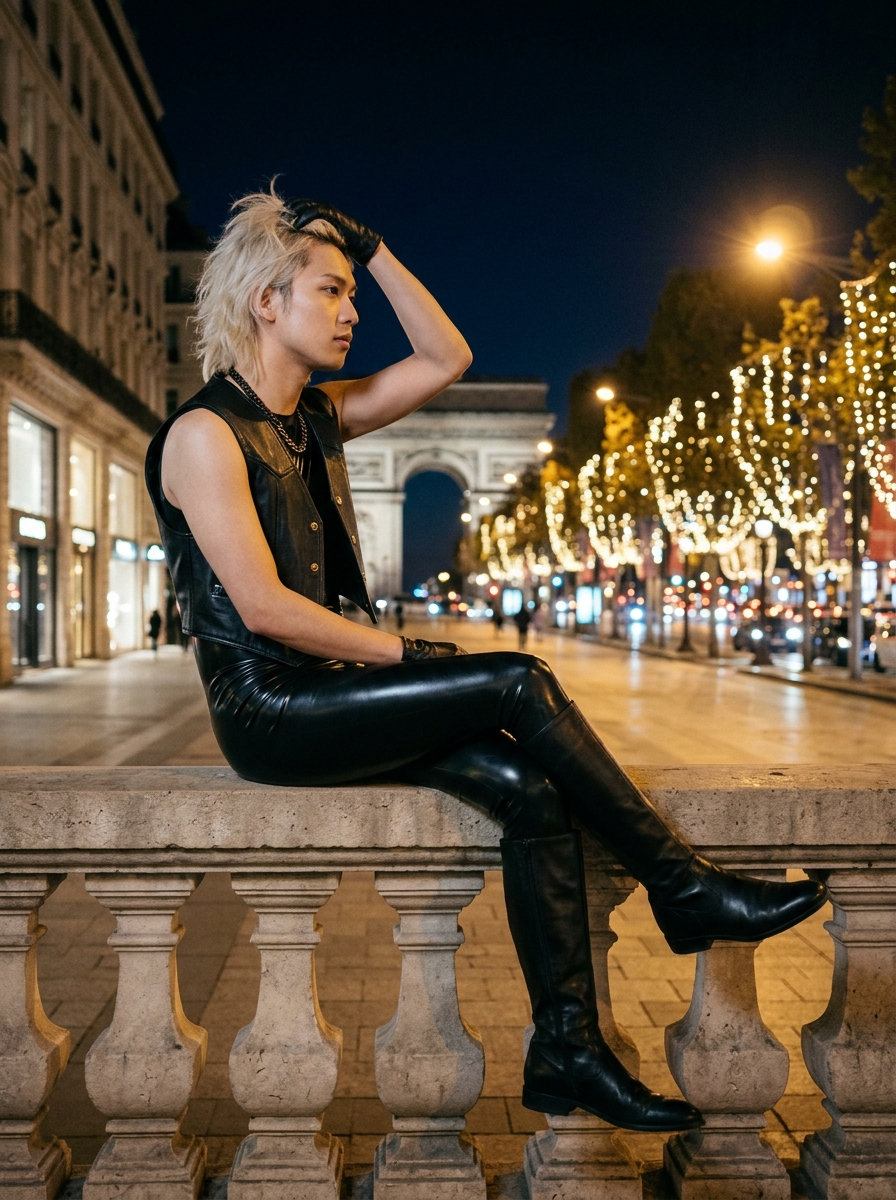 {"scene_manifest": {"version": "3.1.0", "request_type": "photorealistic_generation", "compositional_settings": {"aspect_ratio": "3:4", "framing": "Medium shot", "camera_angle": "Eye-level", "subject_orientation": "Profile view facing left"}}, "subject_entity": {"demographics": {"gender": "male", "age_cohort": "Young Adult", "ethnicity_marker": "Japanese", "body_type": "Athletic build", "archetype": "Travel Influencer / Model"}, "physical_attributes": {"hair": {"color_technique": "Platinum blonde", "texture_descriptors": ["Medium-length", "Tousled"], "current_state": "Being touched by hand"}, "face": {"makeup_style": "well-groomed appearance", "specific_features": ["Defined natural features", "Soft skin texture", "Dark eyes"], "expression_gaze": "Contemplative, looking away into distance"}}, "styling_and_apparel": {"base_garment": {"material": "latex", "type": "Sleeveless jumpsuit", "fit": "Skin-tight"}, "outer_layer": {"color": "with Gold Hardware", "type": "Structured vest"}, "footwear": {"type": "Knee-high boots"}, "accessories": {"neckwear": "leather chain", "handwear": "leather gloves"}, "adornments": {"grooming": "Groomed nails"}}, "pose_and_action": {"primary_posture": "Seated on ledge", "limb_placement": {"legs": "Crossed", "arms": "One hand raised running through hair"}}}, "environmental_context": {"geo_location": {"landmark_name": "Champs-Élysées", "city": "Paris", "country": "France"}, "scene_elements": {"foreground": "Ornate Parisian stone balustrade (subject seat)", "midground": "Tree-lined avenue with glowing lights and luxury storefronts", "background": "The illuminated Arc de Triomphe in the distance, bokeh of city traffic"}, "atmospherics": {"time_of_day": "Night", "sky_condition": "Dark, clear night sky", "mood_descriptors": ["Romantic", "Luxurious", "Cinematic", "Electric"]}}, "rendering_specifications": {"photographic_equipment": {"camera_body": "High-end DSLR", "lens_choice": "Portrait prime lens (50mm or 85mm)", "aperture_setting": "f/2.8 (Shallow depth of field)", "focus_point": "Sharp focus on subject eyes/face"}, "lighting_design": {"scheme": "Mixed Cinematic City Lighting", "sources": [{"type": "Key Light", "color": "Soft warm streetlamp glow", "target": "Subject face and hair"}, {"type": "Background Light", "target": "Avenue trees and distance"}, {"type": "Ambient Fill", "color": "Faint urban night glow", "source": "Surrounding city"}]}, "post_processing_style": {"aesthetic": "35mm film grain", "resolution": "8K", "texture_quality": "Highly detailed, photorealistic"}}}}