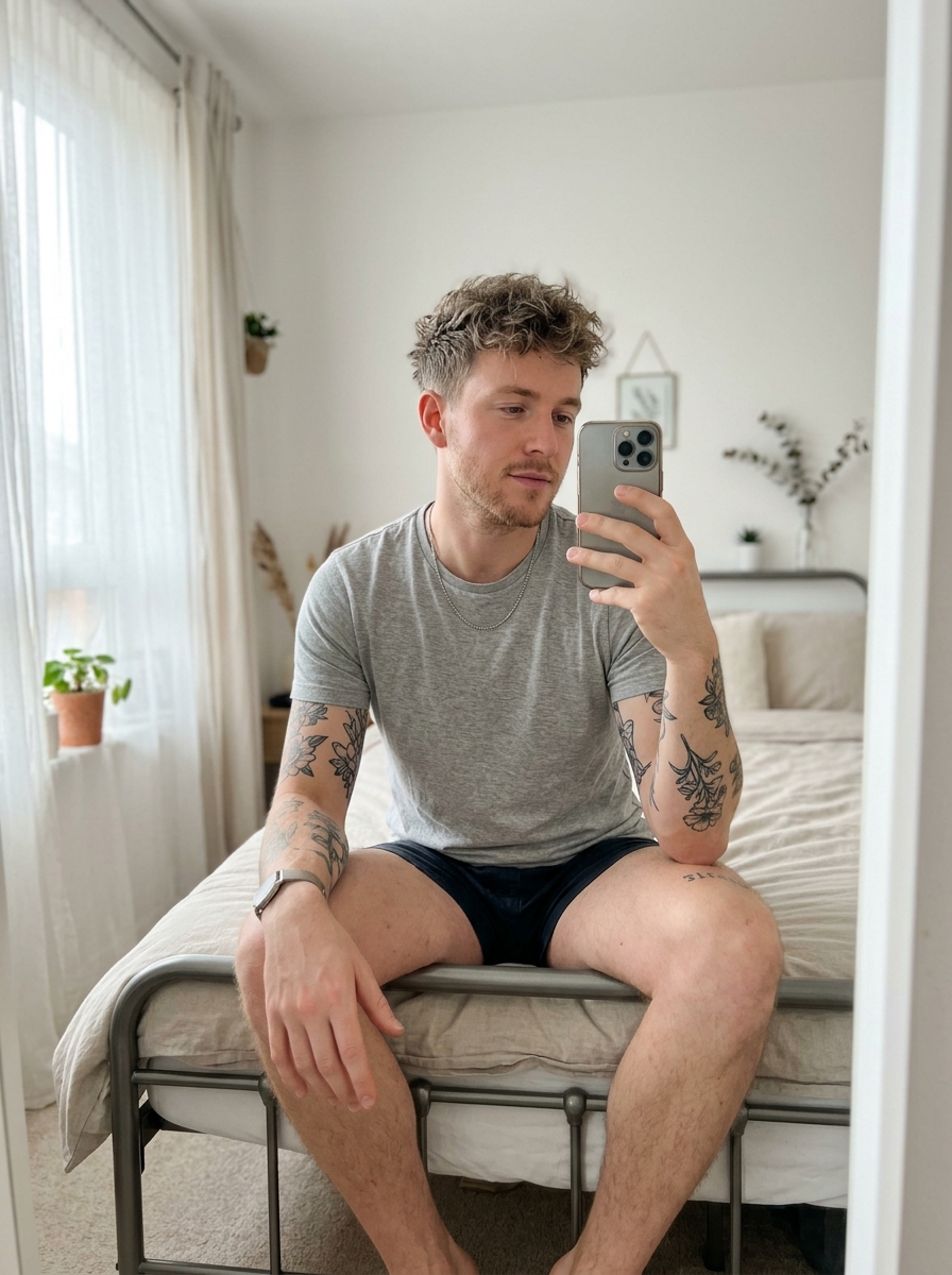 {"scene_type": "Indoor lifestyle portrait", "environment": {"location": "Bright bedroom with soft natural daylight", "background": {"bed": "metal-frame bed with simple neutral bedding", "decor": "Minimalistic decor with small potted plants and subtle botanical accents", "windows": "Large window with sheer curtains allowing diffused sunlight", "color_palette": "Soft whites, creams, light neutrals with subtle green tones"}, "atmosphere": "Calm, , cozy, airy"}, "subject": {"gender_presentation": "Masculine", "approximate_age_group": "Young adult", "skin_tone": "Fair with natural texture", "hair": {"style": "Short, tousled, textured"}, "facial_features": {"expression": "Soft, contemplative, relaxed", "makeup": "Groomed, natural with light stubble"}}, "body_details": {"build": "Lean, athletic", "visible_tattoos": ["Floral and illustrative tattoos on arms", "Small tattoo on "]}}, "pose": {"position": "Seated on a bed", "legs": "One leg bent relaxed, the other extended", "hands": "One hand holding a phone in front of face, the other resting on knee thoughtfully", "orientation": "Facing a mirror for a selfie-style composition"}, "clothing": {"outfit_type": "Light loungewear: fitted t-shirt and boxer shorts", "material": "Soft cotton", "details": "Crew neck, relaxed fit"}, "styling": {"accessories": ["Simple chain necklace", "Watch"], "nails": "Short, groomed", "overall_style": "Relaxed, masculine, aesthetic"}, "lighting": {"type": "Natural light", "source": "Window from the side", "quality": "Soft, diffused, even illumination", "shadows": "Gentle and minimal, enhancing natural features"}, "mood": {"emotional_tone": "Serene, introspective, warm", "visual_feel": "Peaceful, , aesthetically soft"}, "camera_details": {"camera_type": "Smartphone camera", "lens_equivalent": "Wide-angle (approx. 24–28mm)", "perspective": "Mirror selfie perspective", "focus": "Sharp focus on subject with natural depth", "aperture_simulation": "f/1.8 – f/2.2 look", "iso_simulation": "Low ISO for clean image", "shutter_speed_simulation": "Fast enough to avoid motion blur", "white_balance": "Neutral daylight"}, "rendering_style": {"realism_level": "Ultra photorealistic", "detail_level": "High skin texture detail, realistic lighting falloff, natural fabric behavior", "post_processing": "Soft contrast, gentle highlights, natural color grading", "artifacts": "None, clean and crisp image quality"}}}