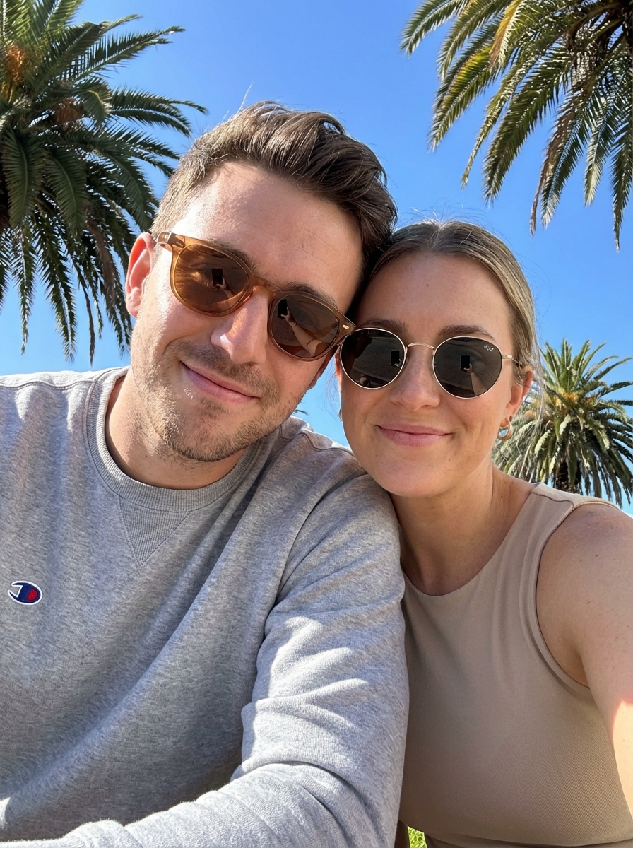 {"scene_type": "outdoor lifestyle portrait", "composition": {"framing": "tight medium close-up selfie", "orientation": "vertical", "camera_angle": "slightly low-angle handheld selfie", "subjects_positioning": "two subjects centered, heads close together, leaning inward", "cropping": "cropped at upper torso, emphasis on faces", "depth_of_field": "deep focus, background clearly visible but not dominant"}, "subjects": [{"gender_presentation": "male", "approx_age_range": "late 20s to early 30s", "facial_expression": "relaxed, subtle smile", "pose": "head tilted slightly toward second subject", "hair": {hair, "style": "short sides with voluminous textured top", "finish": "natural with light sun highlights"}, "facial_hair": "short stubble beard", "accessories": {"eyewear": "transparent brown acetate sunglasses with reflective lenses", "ear_piercing": "small if(gender=f){stud earring } in left ear"}, "clothing": {"type": "crewneck sweatshirt", hair, "branding": "text logo partially visible", "fabric_texture": "soft cotton fleece"}}, {"gender_presentation": "model", "approx_age_range": "mid to late 20s", "facial_expression": "gentle smile, relaxed", "pose": "leaning into first subject, head slightly angled", "hair": {"color": "medium to dark brown", "style": "long, straight with slight natural wave", "part": "center part", "finish": "smooth, sunlit highlights"}, "accessories": {"eyewear": "round metal-frame sunglasses with dark lenses", "jewelry": "delicate chain necklace"}, "clothing": {"type": "sleeveless top", "color": "neutral beige/tan", "fabric_texture": "lightweight, smooth"}}], "lighting": {"type": "natural sunlight", "direction": "top-right, direct midday sun", "quality": "bright, crisp, high clarity", "shadows": "soft but defined under chin and jawlines", "highlights": "strong highlights on hair, skin, and sunglasses"}, "color_palette": {"dominant_colors": ["sky blue", "palm green", "light gray", "warm skin tones"], "temperature": "warm-neutral", "saturation": "moderate to high", "contrast": "medium-high"}, "background": {"environment": "tropical outdoor setting", "elements": ["clear blue sky", "palm tree foliage"], "detail_level": "clean and uncluttered", "context": "vacation or leisure atmosphere"}, "technical_traits": {"camera_type": "smartphone front-facing camera", "lens_equivalent": "wide-angle selfie lens", "sharpness": "high facial sharpness", "noise": "minimal", "dynamic_range": "good, retains sky and skin detail", "post_processing": "light color correction, slight contrast and warmth boost"}, "artistic_style": {"aesthetic": "casual modern lifestyle", "mood": "intimate, relaxed, sunny", "visual_trend": "social media influencer couple portrait", "authenticity": "candid yet curated"}, "overall_impression": "Bright, clean, tropical couple selfie emphasizing closeness, warmth, and effortless lifestyle appeal suitable for social media or influencer-style content."}