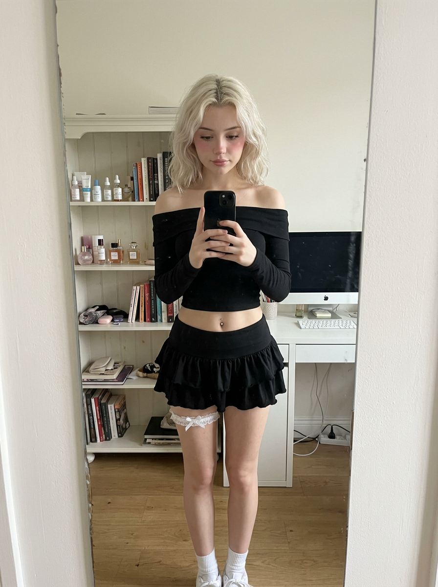 {"scene":"bedroom mirror selfie, home setting with bookshelf and desk setup","subject":{"character":"PLATINUM BLONDE GIRL, early 20s, slim frame","face":{"structure":"soft features, delicate jawline, doll-like","skin":"porcelain pale with pink blush on cheeks","eyes":{"shape":"large doe eyes","color":"light brown-hazel","expression":"looking down at phone screen, soft dreamy"},"mouth":{"lips":"full, natural pink, relaxed soft pout"},"makeup":"natural with heavy pink blush, subtle"},"hair":{"color":"PLATINUM BLONDE white-silver","length":"shoulder length","texture":"soft wavy, slightly messy","style":"middle part, loose waves framing face","shine":"healthy shine"}},"pose":{"overall":"standing mirror selfie, relaxed casual","position":{"base":"standing in front of mirror","orientation":"facing mirror straight on"}," ":{"direction":"facing camera","posture":"relaxed, slight hip tilt"},"arms":{"right":"holding iphone up taking selfie","left":"relaxed at side"},"head":{"angle":"looking at phone screen","expression":"soft, casual, candid"}},"outfit":{"top":{"type":"black off-shoulder long sleeve crop top","fit":"tight, form fitting","neckline":"off shoulder, collarbones","length":"cropped, midriff and stomach"},"bottom":{"type":"black ruffled micro mini skirt","style":"tiered ruffles, very short","length":"extremely short, barely covering"},"accessories":{"garter":"white lace garter on upper ","piercing":"belly button piercing, small silver"}},"body":{"type":"slim, toned, ","midriff":"flat toned stomach ","skin":"pale porcelain, smooth"},"environment":{"location":"bedroom, personal space","background":{"furniture":"white bookshelf unit behind","items":"books, skincare products, perfumes on shelves","desk":"computer setup , white keyboard, monitor","aesthetic":"messy but curated, lived-in"},"mirror":"full length or large mirror for selfie"},"lighting":{"type":"natural daylight from window","quality":{"intensity":"soft, bright, flattering","direction":"front or side natural light"},"on_subject":{"skin":"soft glow, smooth","hair":"platinum catching light"}},"photography":{"type":"mirror selfie, iphone photo","angle":"straight on, eye level","framing":"waist up to full body","focus":"sharp on subject","style":"casual instagram (do not show layout or UI) selfie, candid bedroom"},"color_palette":{"subject":{"hair":"PLATINUM white-silver blonde","skin":"porcelain pale with pink blush","outfit":"all black with white lace accent"},"environment":{"bookshelf":"white with colorful book spines","overall":"neutral bedroom tones"}},"vibe":{"energy":"casual, candid, effortlessly pretty","mood":"soft, dreamy, bedroom aesthetic","aesthetic":"instagram (do not show layout or UI) baddie meets soft girl"},"critical_requirements":{"HAIR":"platinum blonde shoulder length, soft waves","FACE":"pink blush on cheeks, soft expression, looking at phone","TOP":"black off-shoulder long sleeve crop top","SKIRT":"black ruffled micro mini skirt","MIDRIFF":" toned stomach with belly piercing","GARTER":"white lace garter on ","SETTING":"bedroom with bookshelf and desk behind","STYLE":"mirror selfie with iphone"}}