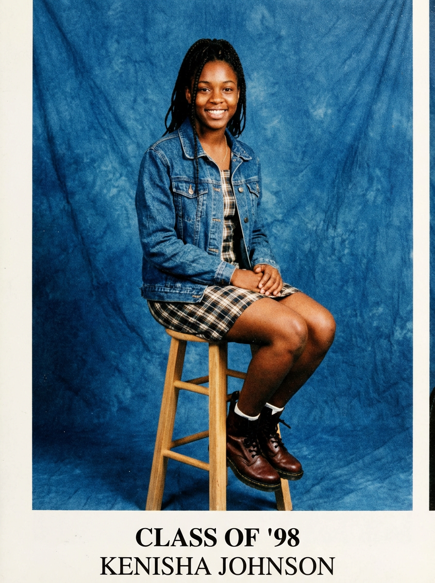 (school portrait) photo headshot of a young 18 y o model in 1990s style, nineties style, 90s, 1990s fashion, 1990s hair, school, model is sitting and posing for a (yearbook) picture, blue yearbook background, official school yearbook photo, model sitting (looking straight into camera), (school shoot), (inside), blue yearbook background
