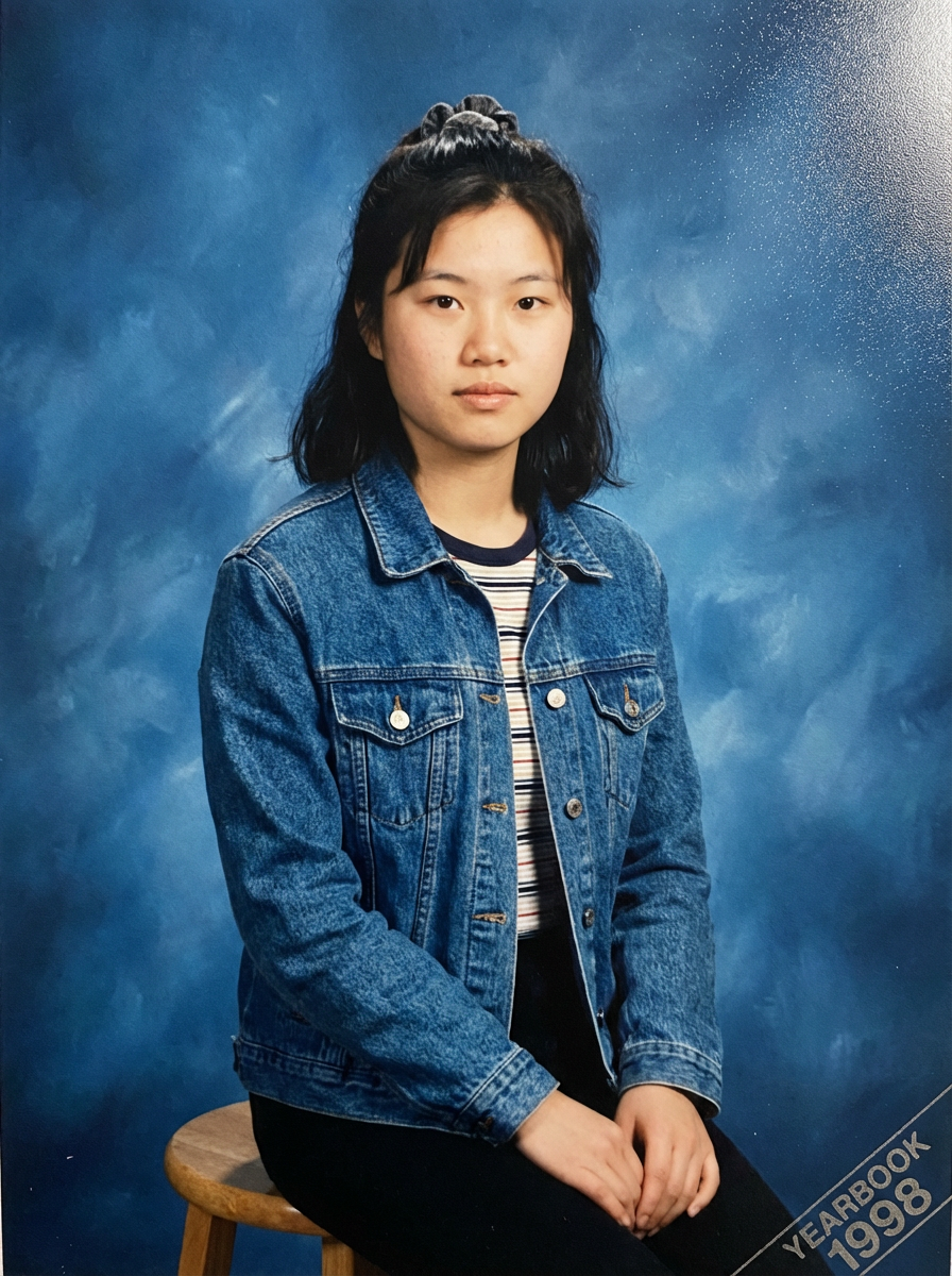 (school portrait) photo headshot of a young 18 y o model in 1990s style, nineties style, 90s, 1990s fashion, 1990s hair, school, model is sitting and posing for a (yearbook) picture, blue yearbook background, official school yearbook photo, model sitting (looking straight into camera), (school shoot), (inside), blue yearbook background