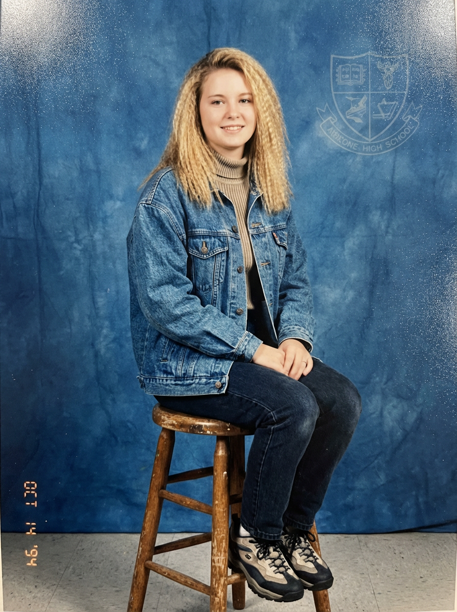 (school portrait) photo headshot of a young 18 y o model in 1990s style, nineties style, 90s, 1990s fashion, 1990s hair, school, model is sitting and posing for a (yearbook) picture, blue yearbook background, official school yearbook photo, model sitting (looking straight into camera), (school shoot), (inside), blue yearbook background