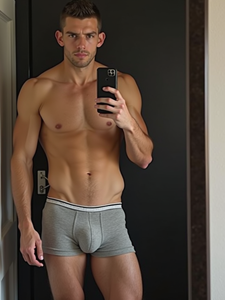 seductive model wearing boxer shorts, doing mirror selfie, holding iPhone, full body, their reflection captured in a sultry pose. the photo emphasizes their exaggerated, idealized body shapes.