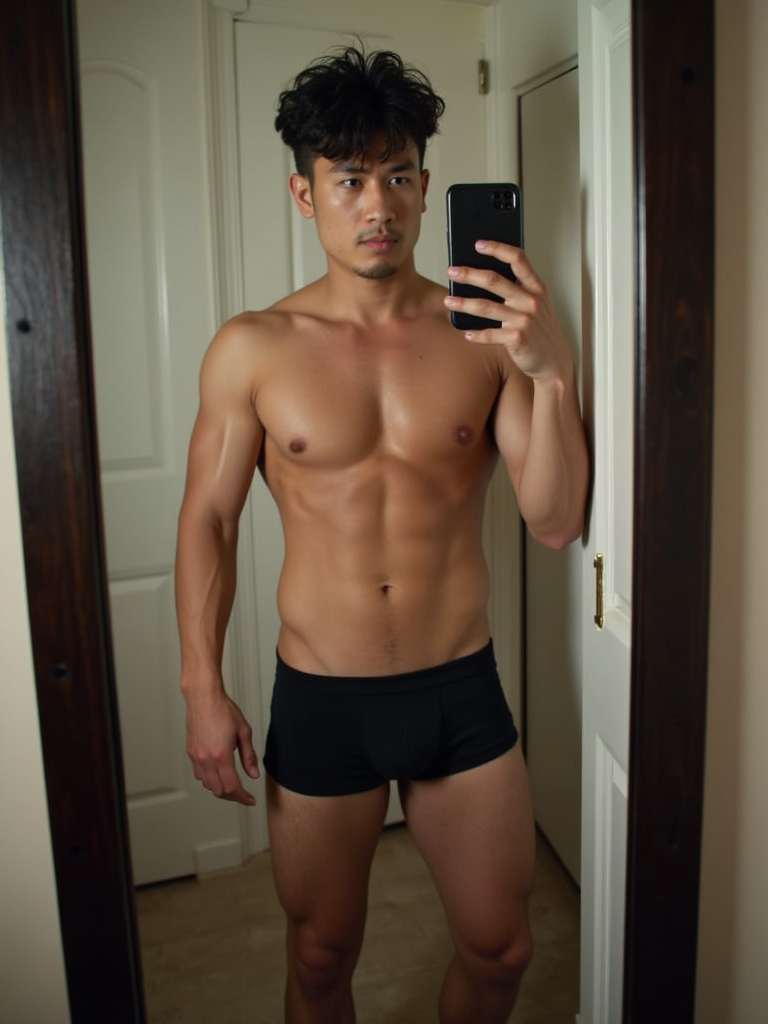 seductive model wearing boxer shorts, doing mirror selfie, holding iPhone, full body, their reflection captured in a sultry pose. the photo emphasizes their exaggerated, idealized body shapes.