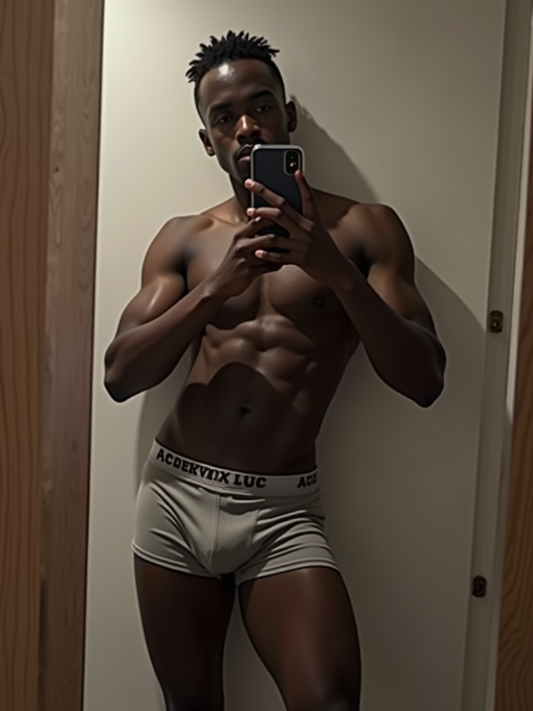 seductive model wearing boxer shorts, doing mirror selfie, holding iPhone, full body, their reflection captured in a sultry pose. the photo emphasizes their exaggerated, idealized body shapes.
