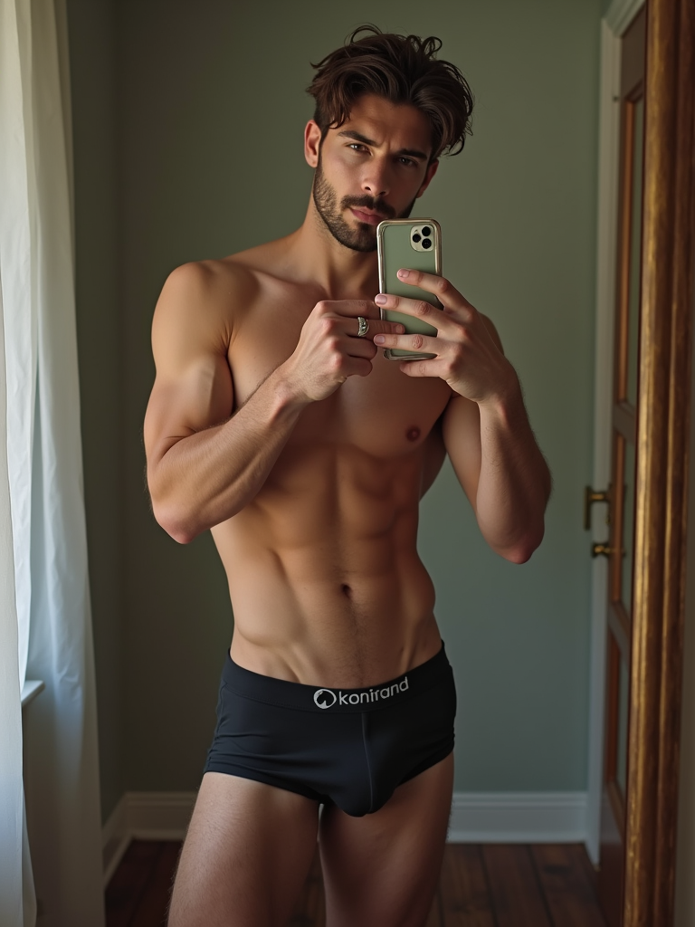 seductive model wearing boxer shorts, doing mirror selfie, holding iPhone, full body, their reflection captured in a sultry pose. the photo emphasizes their exaggerated, idealized body shapes.