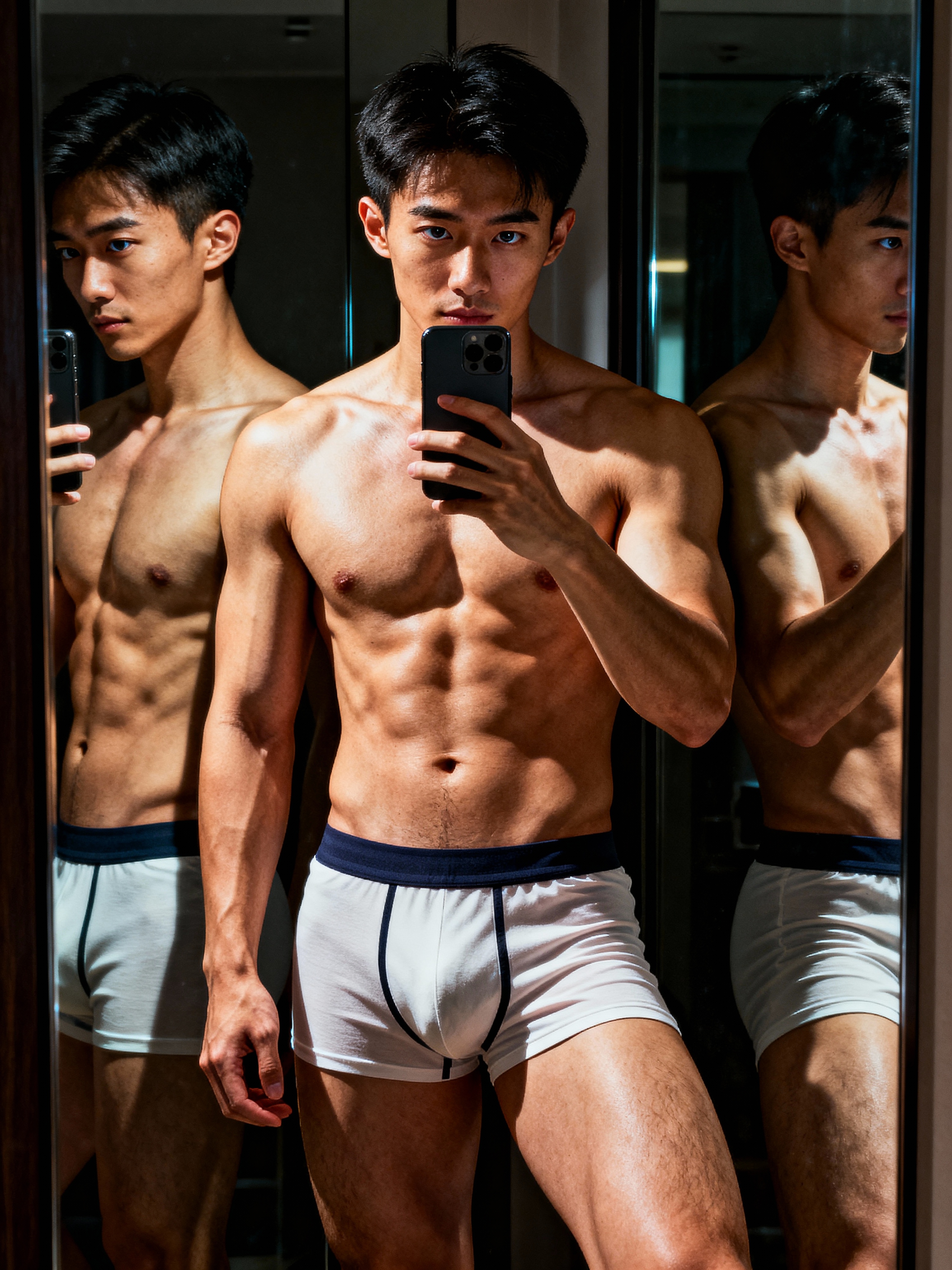 seductive model wearing boxer shorts, doing mirror selfie, holding iPhone, full body, their reflection captured in a sultry pose. the photo emphasizes their exaggerated, idealized body shapes.