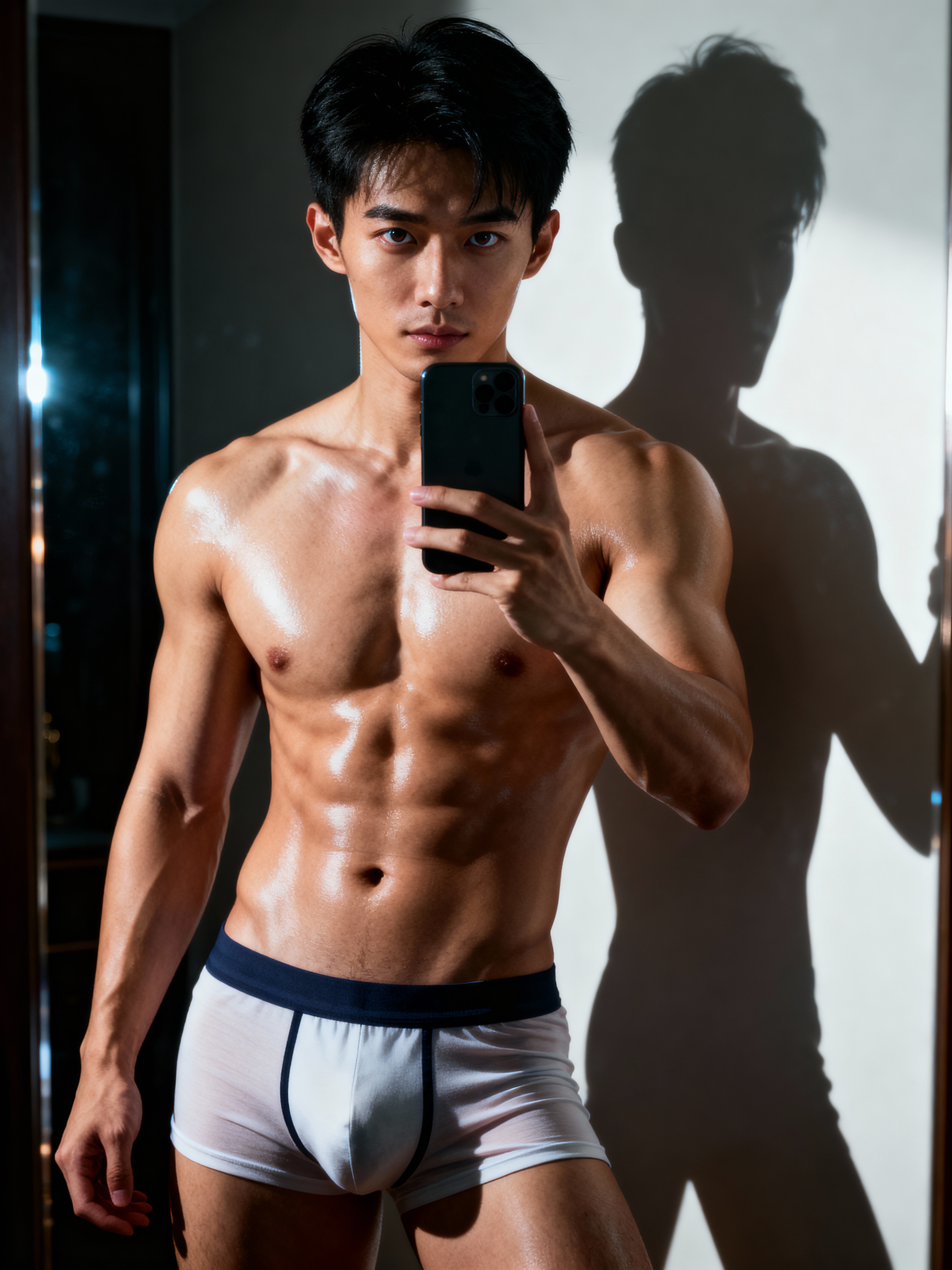 seductive model wearing boxer shorts, doing mirror selfie, holding iPhone, full body, their reflection captured in a sultry pose. the photo emphasizes their exaggerated, idealized body shapes.