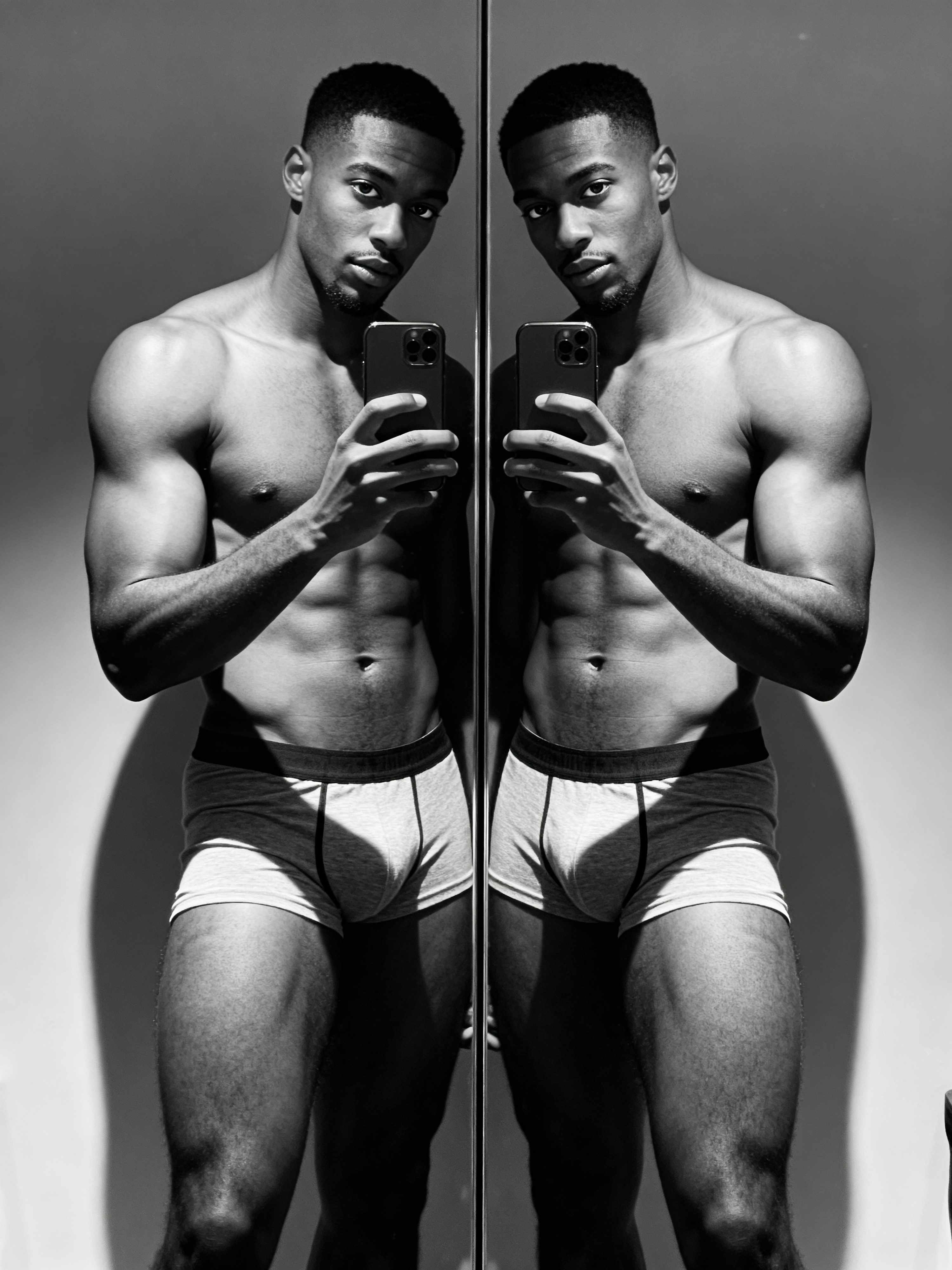 seductive model wearing boxer shorts, doing mirror selfie, holding iPhone, full body, their reflection captured in a sultry pose. the photo emphasizes their exaggerated, idealized body shapes.
